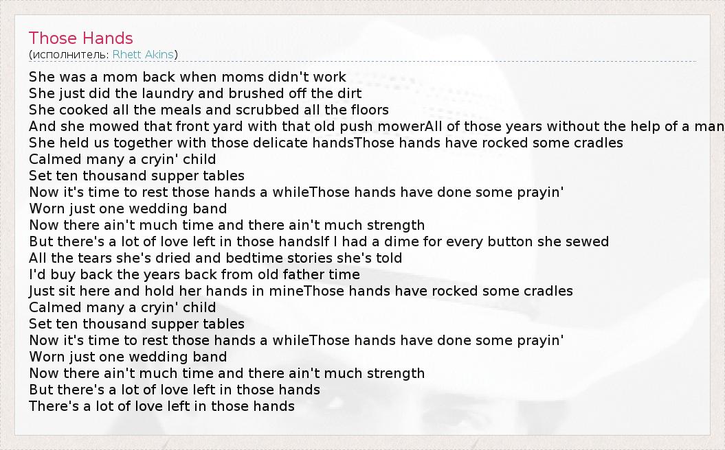 She was a mom back when moms didn't work She just did the laundry and brushed off the dirt She cooked all the meals and scrubbed all the floors And she mowed that front yard with that old push mowerAll of those years without the help of a man She held us together with those delicate handsThose hands have rocked some cradles Calmed many a cryin' child Set ten thousand supper tables Now it's time to rest those hands a whileThose hands have done some prayin' Worn just one wedding band Now there ain't much time and there ain't much strength But there's a lot of love left in those handsIf I had a dime for every button she sewed All the tears she's dried and bedtime stories she's told I'd buy back the years back from old father time Just sit here and hold her hands in mineThose hands have rocked some cradles Calmed many a cryin' child Set ten thousand supper tables Now it's time to rest those hands a whileThose hands have done some prayin' Worn just one wedding band Now there ain't much time and there ain't much strength But there's a lot of love left in those hands There's a lot of love left in those hands