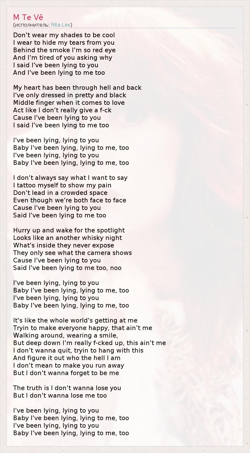 Don't wear my shades to be cool I wear to hide my tears from you Behind the smoke I'm so red eye And I'm tired of you asking why I said I've been lying to you And I've been lying to me too My heart has been through hell and back I've only dressed in pretty and black Middle finger when it comes to love Act like I don't really give a f-ck Cause I've been lying to you I said I've been lying to me too I've been lying, lying to you Baby I've been lying, lying to me, too I've been lying, lying to you Baby I've been lying, lying to me, too I don't always say what I want to say I tattoo myself to show my pain Don't lead in a crowded space Even though we're both face to face Cause I've been lying to you Said I've been lying to me too Hurry up and wake for the spotlight Looks like an another whisky night What's inside they never expose They only see what the camera shows Cause I've been lying to you Said I've been lying to me too, noo I've been lying, lying to you Baby I've been lying, lying to me, too I've been lying, lying to you Baby I've been lying, lying to me, too It's like the whole world's getting at me Tryin to make everyone happy, that ain't me Walking around, wearing a smile, But deep down I'm really f-cked up, this ain't me I don't wanna quit, tryin to hang with this And figure it out who the hell I am I don't mean to make you run away But I don't wanna forget to be me The truth is I don't wanna lose you But I don't wanna lose me too I've been lying, lying to you Baby I've been lying, lying to me, too I've been lying, lying to you Baby I've been lying, lying to me, too