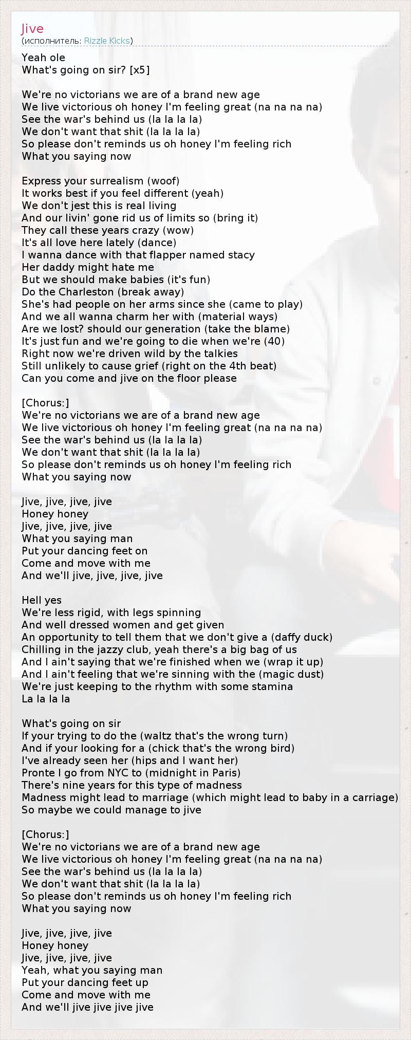 Yeah ole What's going on sir? [x5] We're no victorians we are of a brand new age We live victorious oh honey I'm feeling great (na na na na) See the war's behind us (la la la la) We don't want that shit (la la la la) So please don't reminds us oh honey I'm feeling rich What you saying now Express your surrealism (woof) It works best if you feel different (yeah) We don't jest this is real living And our livin' gone rid us of limits so (bring it) They call these years crazy (wow) It's all love here lately (dance) I wanna dance with that flapper named stacy Her daddy might hate me But we should make babies (it's fun) Do the Charleston (break away) She's had people on her arms since she (came to play) And we all wanna charm her with (material ways) Are we lost? should our generation (take the blame) It's just fun and we're going to die when we're (40) Right now we're driven wild by the talkies Still unlikely to cause grief (right on the 4th beat) Can you come and jive on the floor please [Chorus:] We're no victorians we are of a brand new age We live victorious oh honey I'm feeling great (na na na na) See the war's behind us (la la la la) We don't want that shit (la la la la) So please don't reminds us oh honey I'm feeling rich What you saying now Jive, jive, jive, jive Honey honey Jive, jive, jive, jive What you saying man Put your dancing feet on Come and move with me And we'll jive, jive, jive, jive Hell yes We're less rigid, with legs spinning And well dressed women and get given An opportunity to tell them that we don't give a (daffy duck) Chilling in the jazzy club, yeah there's a big bag of us And I ain't saying that we're finished when we (wrap it up) And I ain't feeling that we're sinning with the (magic dust) We're just keeping to the rhythm with some stamina La la la la What's going on sir If your trying to do the (waltz that's the wrong turn) And if your looking for a (chick that's the wrong bird) I've already seen her (hips and I want her) Pronte I go from NYC to (midnight in Paris) There's nine years for this type of madness Madness might lead to marriage (which might lead to baby in a carriage) So maybe we could manage to jive [Chorus:] We're no victorians we are of a brand new age We live victorious oh honey I'm feeling great (na na na na) See the war's behind us (la la la la) We don't want that shit (la la la la) So please don't reminds us oh honey I'm feeling rich What you saying now Jive, jive, jive, jive Honey honey Jive, jive, jive, jive Yeah, what you saying man Put your dancing feet up Come and move with me And we'll jive jive jive jive