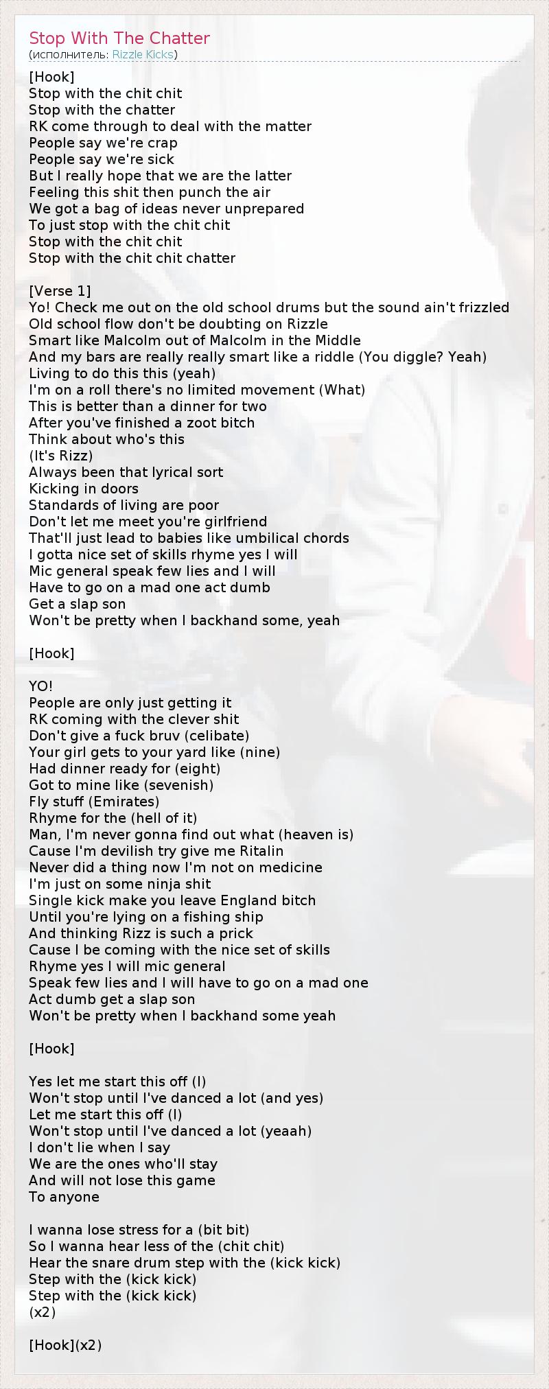 [Hook] Stop with the chit chit Stop with the chatter RK come through to deal with the matter People say we're crap People say we're sick But I really hope that we are the latter Feeling this shit then punch the air We got a bag of ideas never unprepared To just stop with the chit chit Stop with the chit chit Stop with the chit chit chatter [Verse 1] Yo! Check me out on the old school drums but the sound ain't frizzled Old school flow don't be doubting on Rizzle Smart like Malcolm out of Malcolm in the Middle And my bars are really really smart like a riddle (You diggle? Yeah) Living to do this this (yeah) I'm on a roll there's no limited movement (What) This is better than a dinner for two After you've finished a zoot bitch Think about who's this (It's Rizz) Always been that lyrical sort Kicking in doors Standards of living are poor Don't let me meet you're girlfriend That'll just lead to babies like umbilical chords I gotta nice set of skills rhyme yes I will Mic general speak few lies and I will Have to go on a mad one act dumb Get a slap son Won't be pretty when I backhand some, yeah [Hook] YO! People are only just getting it RK coming with the clever shit Don't give a fuck bruv (celibate) Your girl gets to your yard like (nine) Had dinner ready for (eight) Got to mine like (sevenish) Fly stuff (Emirates) Rhyme for the (hell of it) Man, I'm never gonna find out what (heaven is) Cause I'm devilish try give me Ritalin Never did a thing now I'm not on medicine I'm just on some ninja shit Single kick make you leave England bitch Until you're lying on a fishing ship And thinking Rizz is such a prick Cause I be coming with the nice set of skills Rhyme yes I will mic general Speak few lies and I will have to go on a mad one Act dumb get a slap son Won't be pretty when I backhand some yeah [Hook] Yes let me start this off (I) Won't stop until I've danced a lot (and yes) Let me start this off (I) Won't stop until I've danced a lot (yeaah) I don't lie when I say We are the ones who'll stay And will not lose this game To anyone I wanna lose stress for a (bit bit) So I wanna hear less of the (chit chit) Hear the snare drum step with the (kick kick) Step with the (kick kick) Step with the (kick kick) (x2) [Hook](x2)