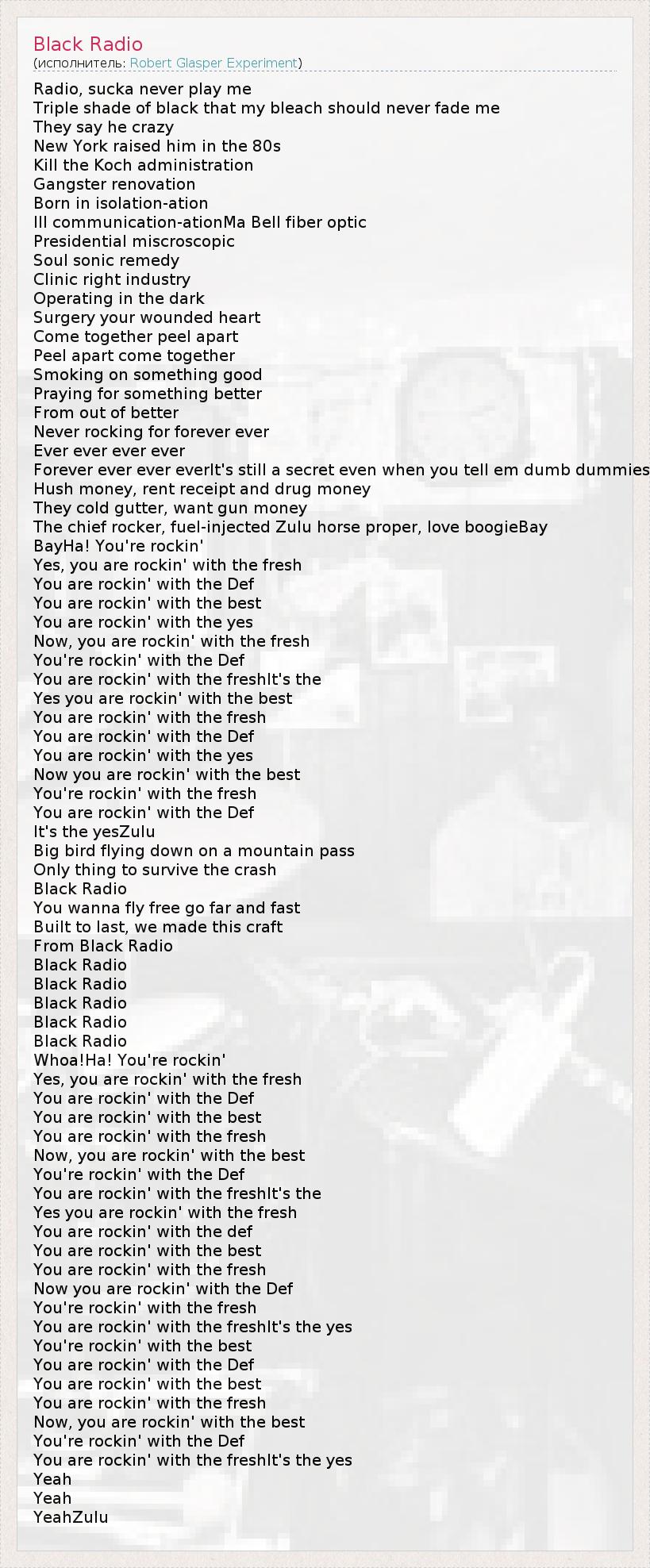 Это интересно:Robert Glasper's Experiment – проект харизматичного пианиста Роберта Гласпера, в рамках которого он исследует возможности объединения джаза, электроники, соула, фанка и хип-хопа.Сам же Роберт Гласпер родился 5 апреля 1978 года в Хьюстоне, шт. Техас. Первым учителем (в 12 лет) стала мать, которая профессионально играла на пианино джаз и блюз. В 14 он уже аккомпанировал на службах в баптистских и католических... продолжение