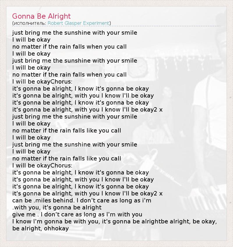 just bring me the sunshine with your smile I will be okay no matter if the rain falls when you call I will be okay just bring me the sunshine with your smile I will be okay no matter if the rain falls when you call I will be okayChorus: it's gonna be alright, I know it's gonna be okay it's gonna be alright, with you I know I'll be okay it's gonna be alright, I know it's gonna be okay it's gonna be alright, with you I know I'll be okay2 x just bring me the sunshine with your smile I will be okay no matter if the rain falls like you call I will be okay just bring me the sunshine with your smile I will be okay no matter if the rain falls like you call I will be okayChorus: it's gonna be alright, I know it's gonna be okay it's gonna be alright, with you I know I'll be okay it's gonna be alright, I know it's gonna be okay it's gonna be alright, with you I know I'll be okay2 x can be .miles behind. I don't care as long as i'm .with you, it's gonna be alright give me . I don't care as long as I'm with you I know I'm gonna be with you, it's gonna be alrightbe alright, be okay, be alright, ohhokay