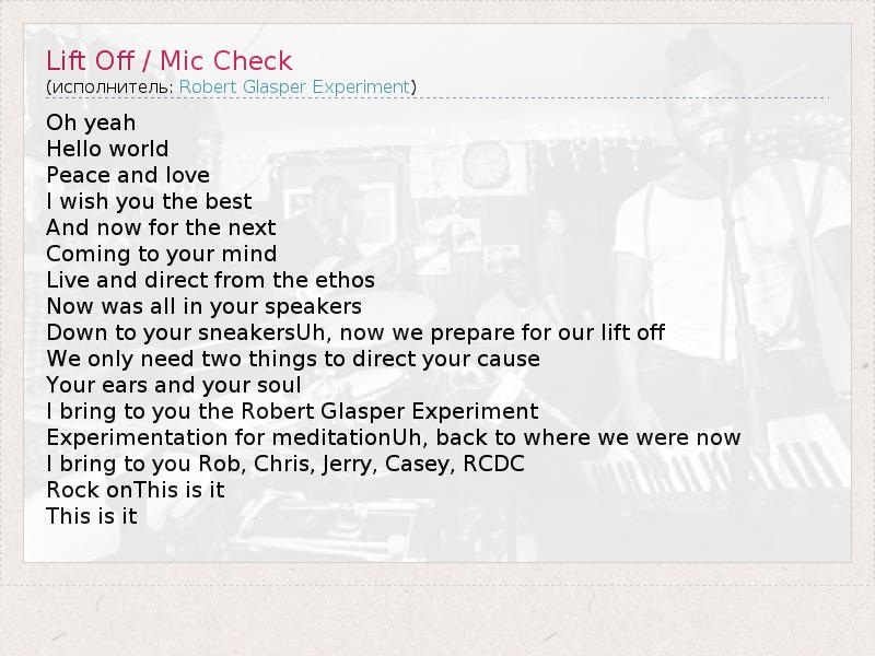 Oh yeah Hello world Peace and love I wish you the best And now for the next Coming to your mind Live and direct from the ethos Now was all in your speakers Down to your sneakersUh, now we prepare for our lift off We only need two things to direct your cause Your ears and your soul I bring to you the Robert Glasper Experiment Experimentation for meditationUh, back to where we were now I bring to you Rob, Chris, Jerry, Casey, RCDC Rock onThis is it This is it