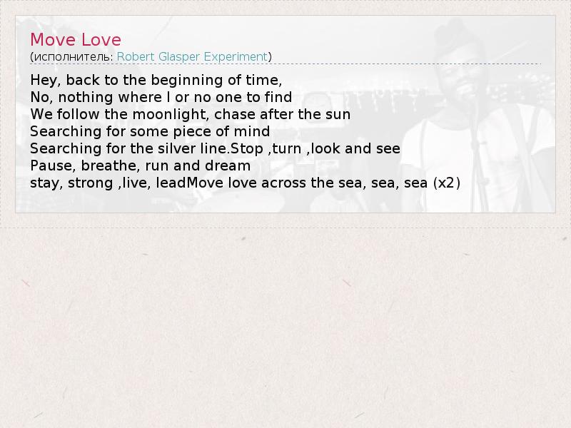 Это интересно:Robert Glasper's Experiment – проект харизматичного пианиста Роберта Гласпера, в рамках которого он исследует возможности объединения джаза, электроники, соула, фанка и хип-хопа.Сам же Роберт Гласпер родился 5 апреля 1978 года в Хьюстоне, шт. Техас. Первым учителем (в 12 лет) стала мать, которая профессионально играла на пианино джаз и блюз. В 14 он уже аккомпанировал на службах в баптистских и католических... продолжение