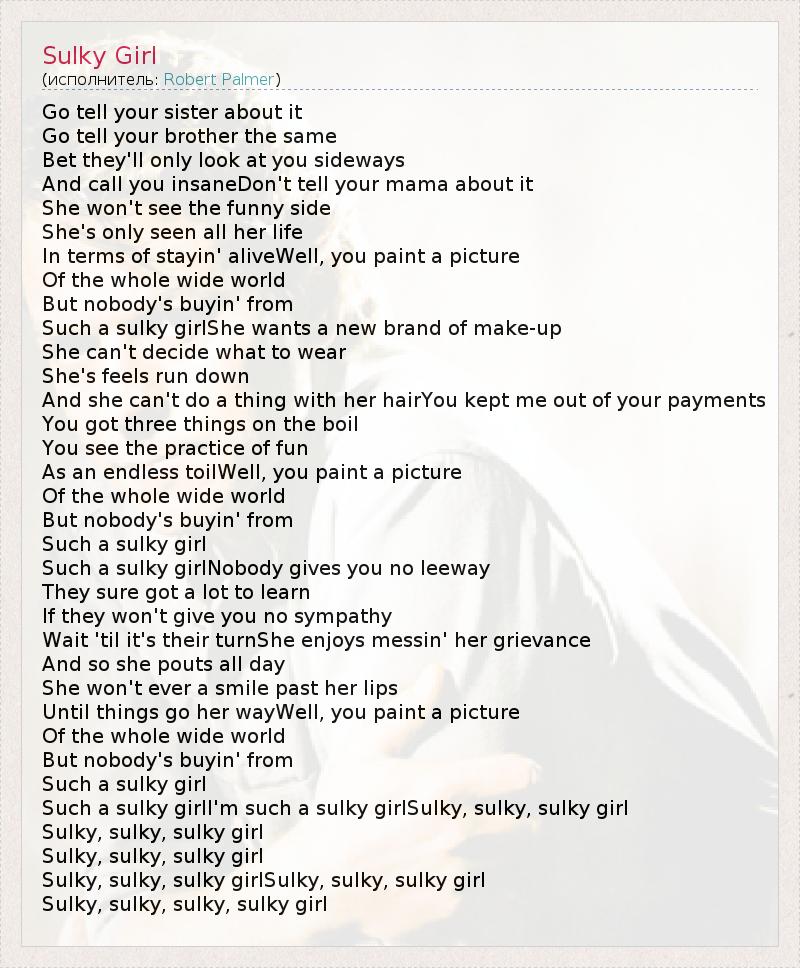 Go tell your sister about it Go tell your brother the same Bet they'll only look at you sideways And call you insaneDon't tell your mama about it She won't see the funny side She's only seen all her life In terms of stayin' aliveWell, you paint a picture Of the whole wide world But nobody's buyin' from Such a sulky girlShe wants a new brand of make-up She can't decide what to wear She's feels run down And she can't do a thing with her hairYou kept me out of your payments You got three things on the boil You see the practice of fun As an endless toilWell, you paint a picture Of the whole wide world But nobody's buyin' from Such a sulky girl Such a sulky girlNobody gives you no leeway They sure got a lot to learn If they won't give you no sympathy Wait 'til it's their turnShe enjoys messin' her grievance And so she pouts all day She won't ever a smile past her lips Until things go her wayWell, you paint a picture Of the whole wide world But nobody's buyin' from Such a sulky girl Such a sulky girlI'm such a sulky girlSulky, sulky, sulky girl Sulky, sulky, sulky girl Sulky, sulky, sulky girl Sulky, sulky, sulky girlSulky, sulky, sulky girl Sulky, sulky, sulky, sulky girl