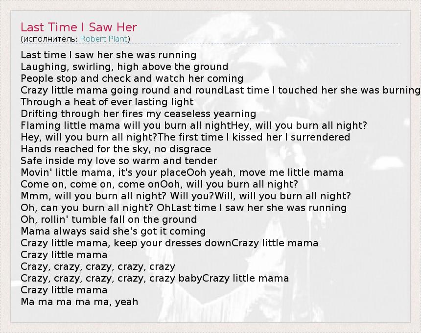 А как ты думаешь, о чем песня "Last Time I Saw Her" ?