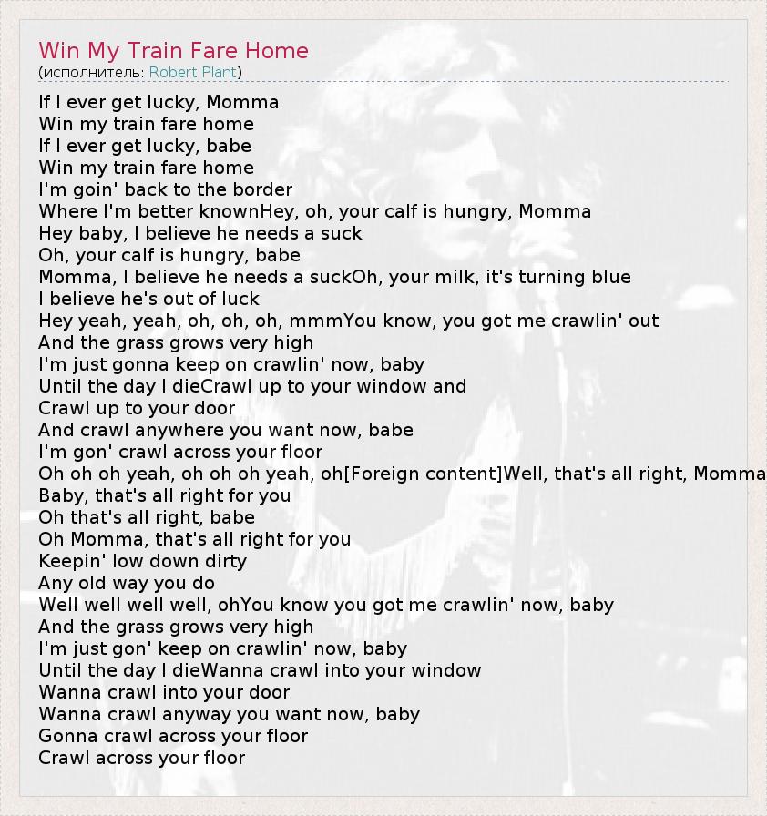 If I ever get lucky, Momma Win my train fare home If I ever get lucky, babe Win my train fare home I'm goin' back to the border Where I'm better knownHey, oh, your calf is hungry, Momma Hey baby, I believe he needs a suck Oh, your calf is hungry, babe Momma, I believe he needs a suckOh, your milk, it's turning blue I believe he's out of luck Hey yeah, yeah, oh, oh, oh, mmmYou know, you got me crawlin' out And the grass grows very high I'm just gonna keep on crawlin' now, baby Until the day I dieCrawl up to your window and Crawl up to your door And crawl anywhere you want now, babe I'm gon' crawl across your floor Oh oh oh yeah, oh oh oh yeah, oh[Foreign content]Well, that's all right, Momma Baby, that's all right for you Oh that's all right, babe Oh Momma, that's all right for you Keepin' low down dirty Any old way you do Well well well well, ohYou know you got me crawlin' now, baby And the grass grows very high I'm just gon' keep on crawlin' now, baby Until the day I dieWanna crawl into your window Wanna crawl into your door Wanna crawl anyway you want now, baby Gonna crawl across your floor Crawl across your floor