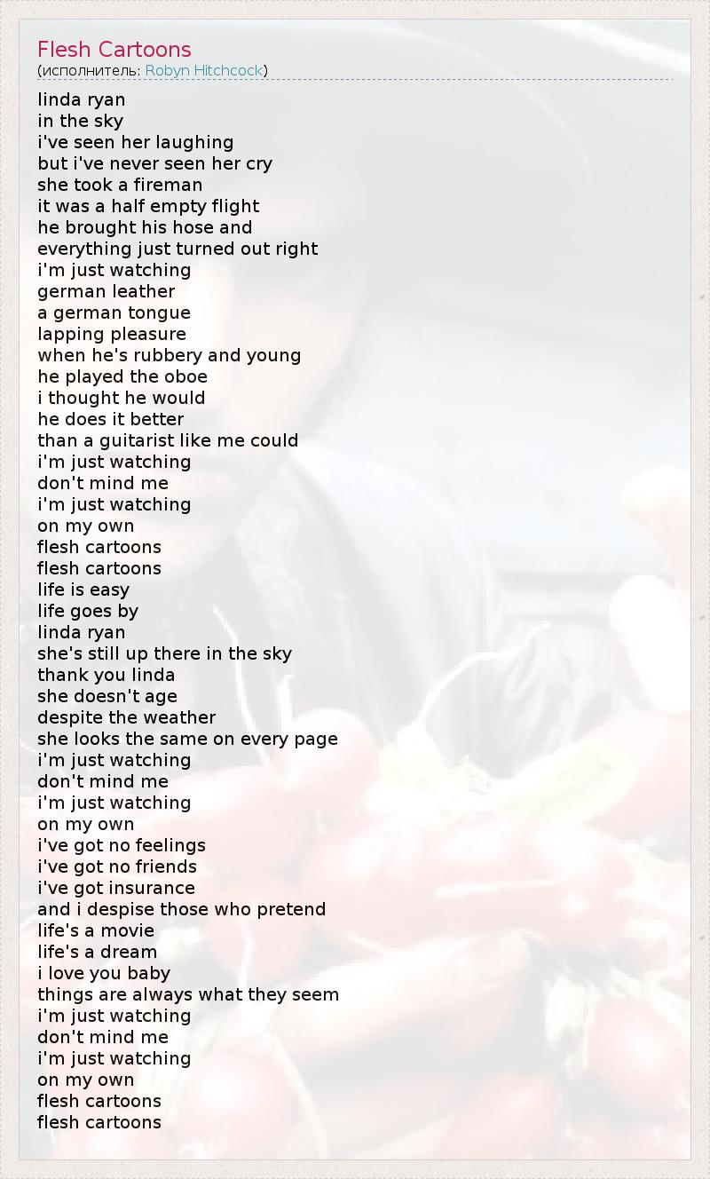 linda ryan in the sky i've seen her laughing but i've never seen her cry she took a fireman it was a half empty flight he brought his hose and everything just turned out right i'm just watching german leather a german tongue lapping pleasure when he's rubbery and young he played the oboe i thought he would he does it better than a guitarist like me could i'm just watching don't mind me i'm just watching on my own flesh cartoons flesh cartoons life is easy life goes by linda ryan she's still up there in the sky thank you linda she doesn't age despite the weather she looks the same on every page i'm just watching don't mind me i'm just watching on my own i've got no feelings i've got no friends i've got insurance and i despise those who pretend life's a movie life's a dream i love you baby things are always what they seem i'm just watching don't mind me i'm just watching on my own flesh cartoons flesh cartoons