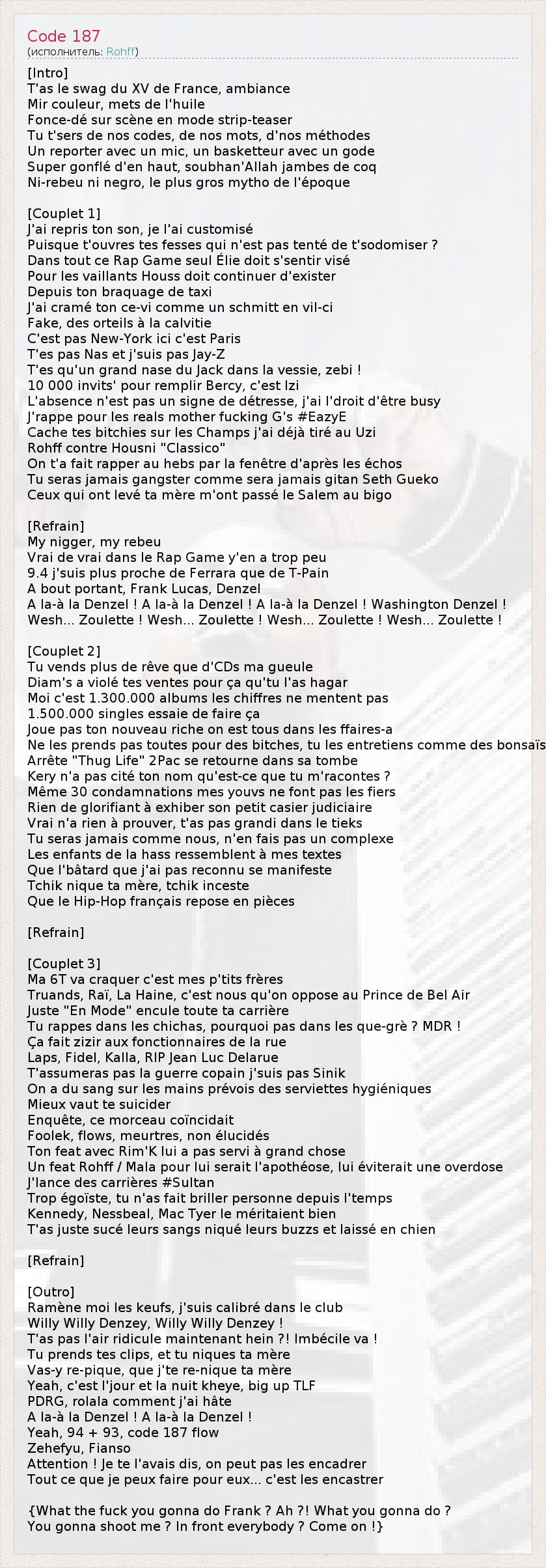 Это интересно:Плохой мальчик парижских предместий. Когда-то он был частью значимой для французской сцены тусовки Mafia k'1 Fry, но их пути разошлись, а сольное творчество Rohff от этого только выиграло. Его музыка, как и музыка Мафии, по большей части являет собой французский тип гангста рэпа, со всеми присущими атрибутами. Если сравнивать французский и американский образцы этого жанра, то французский видится... продолжение