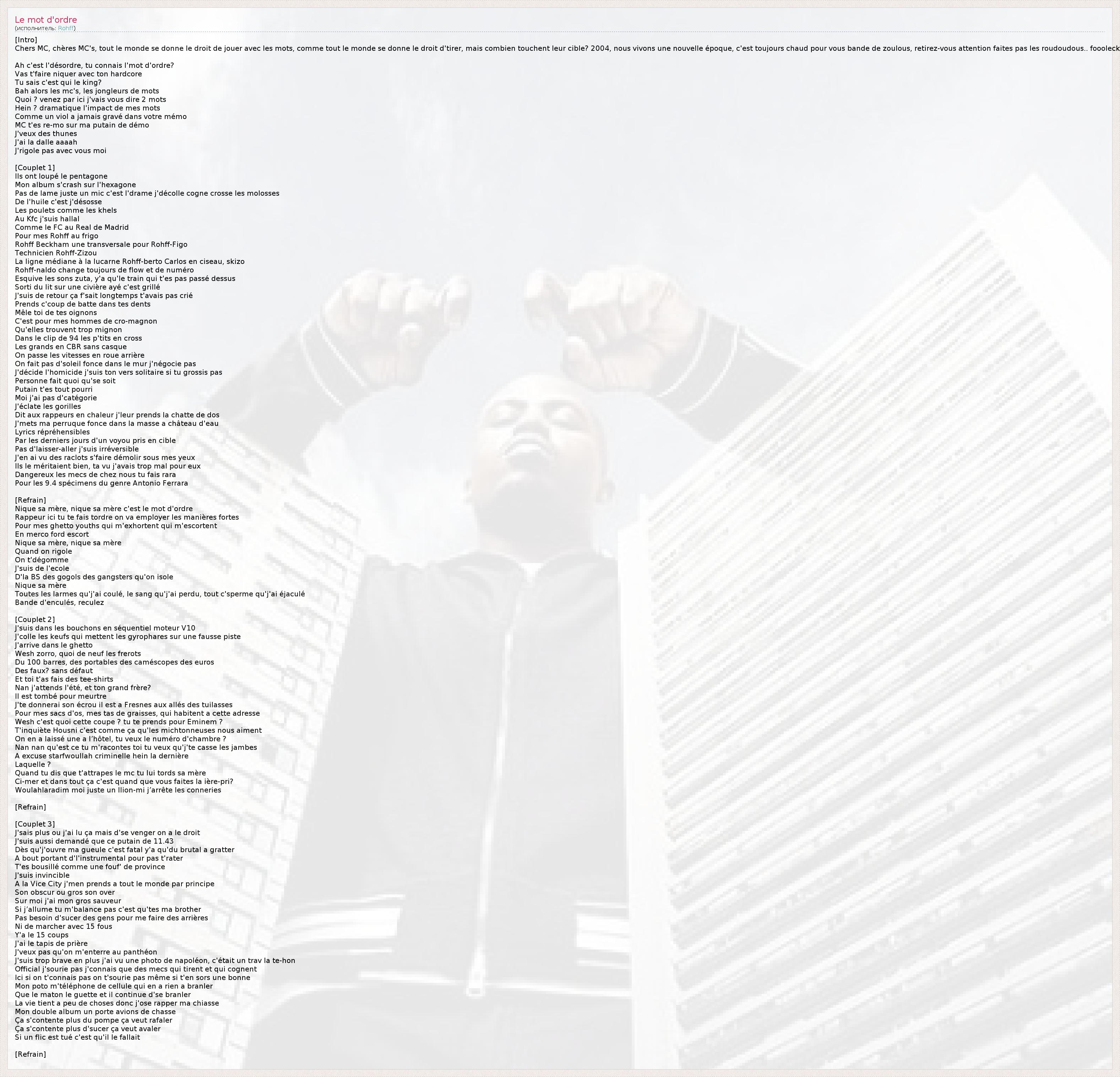 [Intro] Chers MC, chères MC's, tout le monde se donne le droit de jouer avec les mots, comme tout le monde se donne le droit d'tirer, mais combien touchent leur cible? 2004, nous vivons une nouvelle époque, c'est toujours chaud pour vous bande de zoulous, retirez-vous attention faites pas les roudoudous.. foooleck Ah c'est l'désordre, tu connais l'mot d'ordre? Vas t'faire niquer avec ton hardcore Tu sais c'est qui le king? Bah alors les mc's, les jongleurs de mots Quoi ? venez par ici j'vais vous dire 2 mots Hein ? dramatique l'impact de mes mots Comme un viol a jamais gravé dans votre mémo MC t'es re-mo sur ma putain de démo J'veux des thunes J'ai la dalle aaaah J'rigole pas avec vous moi [Couplet 1] Ils ont loupé le pentagone Mon album s'crash sur l'hexagone Pas de lame juste un mic c'est l'drame j'décolle cogne crosse les molosses De l'huile c'est j'désosse Les poulets comme les khels Au Kfc j'suis hallal Comme le FC au Real de Madrid Pour mes Rohff au frigo Rohff Beckham une transversale pour Rohff-Figo Technicien Rohff-Zizou La ligne médiane à la lucarne Rohff-berto Carlos en ciseau, skizo Rohff-naldo change toujours de flow et de numéro Esquive les sons zuta, y'a qu'le train qui t'es pas passé dessus Sorti du lit sur une civière ayé c'est grillé J'suis de retour ça f'sait longtemps t'avais pas crié Prends c'coup de batte dans tes dents Mêle toi de tes oignons C'est pour mes hommes de cro-magnon Qu'elles trouvent trop mignon Dans le clip de 94 les p'tits en cross Les grands en CBR sans casque On passe les vitesses en roue arrière On fait pas d'soleil fonce dans le mur j'négocie pas J'décide l'homicide j'suis ton vers solitaire si tu grossis pas Personne fait quoi qu'se soit Putain t'es tout pourri Moi j'ai pas d'catégorie J'éclate les gorilles Dit aux rappeurs en chaleur j'leur prends la chatte de dos J'mets ma perruque fonce dans la masse a château d'eau Lyrics répréhensibles Par les derniers jours d'un voyou pris en cible Pas d'laisser-aller j'suis irréversible J'en ai vu des raclots s'faire démolir sous mes yeux Ils le méritaient bien, ta vu j'avais trop mal pour eux Dangereux les mecs de chez nous tu fais rara Pour les 9.4 spécimens du genre Antonio Ferrara [Refrain] Nique sa mère, nique sa mère c'est le mot d'ordre Rappeur ici tu te fais tordre on va employer les manières fortes Pour mes ghetto youths qui m'exhortent qui m'escortent En merco ford escort Nique sa mère, nique sa mère Quand on rigole On t'dégomme J'suis de l'ecole D'la BS des gogols des gangsters qu'on isole Nique sa mère Toutes les larmes qu'j'ai coulé, le sang qu'j'ai perdu, tout c'sperme qu'j'ai éjaculé Bande d'enculés, reculez [Couplet 2] J'suis dans les bouchons en séquentiel moteur V10 J'colle les keufs qui mettent les gyrophares sur une fausse piste J'arrive dans le ghetto Wesh zorro, quoi de neuf les frerots Du 100 barres, des portables des caméscopes des euros Des faux? sans défaut Et toi t'as fais des tee-shirts Nan j'attends l'été, et ton grand frère? Il est tombé pour meurtre J'te donnerai son écrou il est a Fresnes aux allés des tuilasses Pour mes sacs d'os, mes tas de graisses, qui habitent a cette adresse Wesh c'est quoi cette coupe ? tu te prends pour Eminem ? T'inquiète Housni c'est comme ça qu'les michtonneuses nous aiment On en a laissé une a l’hôtel, tu veux le numéro d'chambre ? Nan nan qu'est ce tu m'racontes toi tu veux qu'j'te casse les jambes A excuse starfwoullah criminelle hein la dernière Laquelle ? Quand tu dis que t'attrapes le mc tu lui tords sa mère Ci-mer et dans tout ça c'est quand que vous faites la ière-pri? Woulahlaradim moi juste un llion-mi j’arrête les conneries [Refrain] [Couplet 3] J'sais plus ou j'ai lu ça mais d'se venger on a le droit J'suis aussi demandé que ce putain de 11.43 Dès qu'j'ouvre ma gueule c'est fatal y'a qu'du brutal a gratter A bout portant d'l'instrumental pour pas t'rater T'es bousillé comme une fouf' de province J'suis invincible A la Vice City j'men prends a tout le monde par principe Son obscur ou gros son over Sur moi j'ai mon gros sauveur Si j’allume tu m'balance pas c'est qu'tes ma brother Pas besoin d'sucer des gens pour me faire des arrières Ni de marcher avec 15 fous Y'a le 15 coups J'ai le tapis de prière J'veux pas qu'on m'enterre au panthéon J'suis trop brave en plus j'ai vu une photo de napoléon, c'était un trav la te-hon Official j'sourie pas j'connais que des mecs qui tirent et qui cognent Ici si on t'connais pas on t'sourie pas même si t'en sors une bonne Mon poto m'téléphone de cellule qui en a rien a branler Que le maton le guette et il continue d'se branler La vie tient a peu de choses donc j'ose rapper ma chiasse Mon double album un porte avions de chasse Ça s'contente plus du pompe ça veut rafaler Ça s'contente plus d'sucer ça veut avaler Si un flic est tué c'est qu'il le fallait [Refrain]