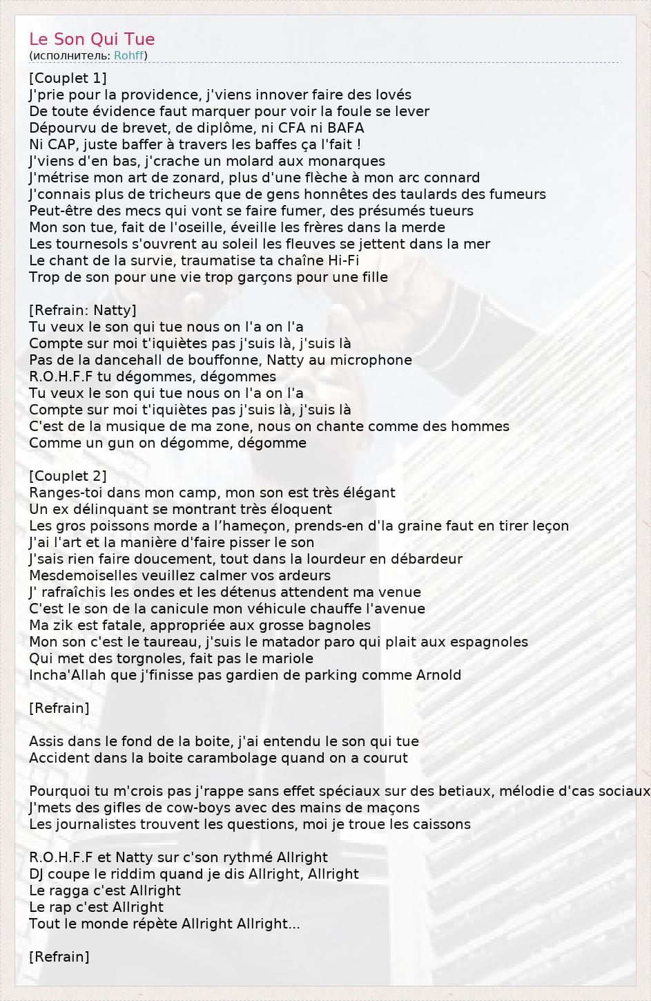 [Couplet 1] J'prie pour la providence, j'viens innover faire des lovés De toute évidence faut marquer pour voir la foule se lever Dépourvu de brevet, de diplôme, ni CFA ni BAFA Ni CAP, juste baffer à travers les baffes ça l'fait ! J'viens d'en bas, j'crache un molard aux monarques J'métrise mon art de zonard, plus d'une flèche à mon arc connard J'connais plus de tricheurs que de gens honnêtes des taulards des fumeurs Peut-être des mecs qui vont se faire fumer, des présumés tueurs Mon son tue, fait de l'oseille, éveille les frères dans la merde Les tournesols s'ouvrent au soleil les fleuves se jettent dans la mer Le chant de la survie, traumatise ta chaîne Hi-Fi Trop de son pour une vie trop garçons pour une fille [Refrain: Natty] Tu veux le son qui tue nous on l'a on l'a Compte sur moi t'iquiètes pas j'suis là, j'suis là Pas de la dancehall de bouffonne, Natty au microphone R.O.H.F.F tu dégommes, dégommes Tu veux le son qui tue nous on l'a on l'a Compte sur moi t'iquiètes pas j'suis là, j'suis là C'est de la musique de ma zone, nous on chante comme des hommes Comme un gun on dégomme, dégomme [Couplet 2] Ranges-toi dans mon camp, mon son est très élégant Un ex délinquant se montrant très éloquent Les gros poissons morde a l’hameçon, prends-en d'la graine faut en tirer leçon J'ai l'art et la manière d'faire pisser le son J'sais rien faire doucement, tout dans la lourdeur en débardeur Mesdemoiselles veuillez calmer vos ardeurs J' rafraîchis les ondes et les détenus attendent ma venue C'est le son de la canicule mon véhicule chauffe l'avenue Ma zik est fatale, appropriée aux grosse bagnoles Mon son c'est le taureau, j'suis le matador paro qui plait aux espagnoles Qui met des torgnoles, fait pas le mariole Incha'Allah que j'finisse pas gardien de parking comme Arnold [Refrain] Assis dans le fond de la boite, j'ai entendu le son qui tue Accident dans la boite carambolage quand on a courut Pourquoi tu m'crois pas j'rappe sans effet spéciaux sur des betiaux, mélodie d'cas sociaux J'mets des gifles de cow-boys avec des mains de maçons Les journalistes trouvent les questions, moi je troue les caissons R.O.H.F.F et Natty sur c'son rythmé Allright DJ coupe le riddim quand je dis Allright, Allright Le ragga c'est Allright Le rap c'est Allright Tout le monde répète Allright Allright... [Refrain]