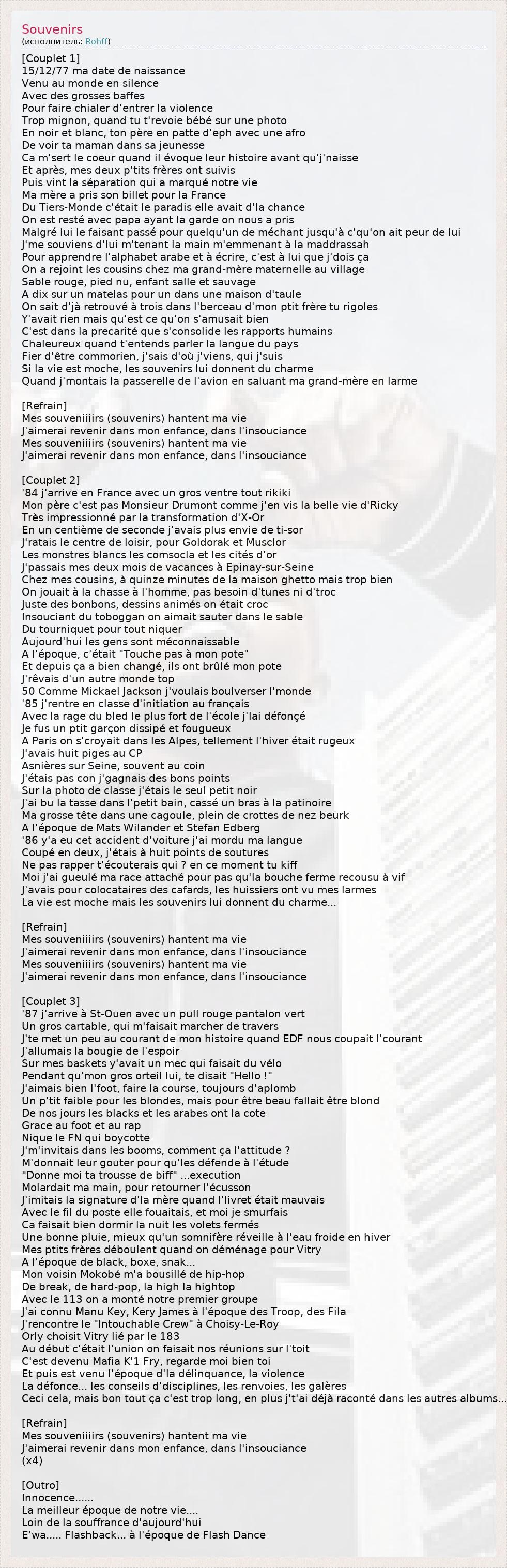 Это интересно:Плохой мальчик парижских предместий. Когда-то он был частью значимой для французской сцены тусовки Mafia k'1 Fry, но их пути разошлись, а сольное творчество Rohff от этого только выиграло. Его музыка, как и музыка Мафии, по большей части являет собой французский тип гангста рэпа, со всеми присущими атрибутами. Если сравнивать французский и американский образцы этого жанра, то французский видится... продолжение