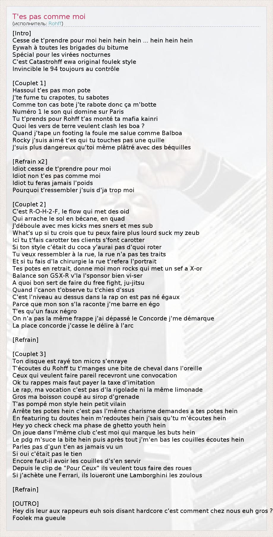 [Intro] Cesse de t'prendre pour moi hein hein hein ... hein hein hein Eywah à toutes les brigades du bitume Spécial pour les virées nocturnes C'est Catastrohff ewa original foulek style Invincible le 94 toujours au contrôle [Couplet 1] Hassoul t'es pas mon pote J'te fume tu crapotes, tu sabotes Comme ton cas bote j'te rabote donc ça m'botte Numéro 1 le son qui domine sur Paris Tu t'prends pour Rohff t'as monté ta mafia kainri Quoi les vers de terre veulent clash les boa ? Quand j'tape un footing la foule me salue comme Balboa Rocky j'suis aimé t'es qui tu touches pas une quille J'suis plus dangereux qu'toi même plâtré avec des béquilles [Refrain x2] Idiot cesse de t'prendre pour moi Idiot non t'es pas comme moi Idiot tu feras jamais l'poids Pourquoi t'ressembler j'suis d'ja trop moi [Couplet 2] C'est R-O-H-2-F, le flow qui met des oid Qui arrache le sol en bécane, en quad J'déboule avec mes kicks mes sners et mes sub What's up si tu crois que tu peux faire plus lourd suck my zeub Ici tu t'fais carotter tes clients s'font carotter Si ton style c'était du coca y'aurai pas d'quoi roter Tu veux ressembler à la rue, la rue n'a pas tes traits Et si tu fais d'la chirurgie la rue t'refera l'portrait Tes potes en retrait, donne moi mon rocks qui met un sef a X-or Balance son GSX-R v'la l'sponsor bien vi-ser A quoi bon sert de faire du free fight, ju-jitsu Quand l'canon t'observe tu t'chies d'ssus C'est l'niveau au dessus dans la rap on est pas né égaux Parce que mon son s'la raconte j'me barre en égo T'es qu'un faux négro On n'a pas la même frappe j'ai dépassé le Concorde j'me démarque La place concorde j'casse le délire à l'arc [Refrain] [Couplet 3] Ton disque est rayé ton micro s'enraye T'écoutes du Rohff tu t'manges une bite de cheval dans l'oreille Ceux qui veulent faire pareil recevront une convocation Ok tu rappes mais faut payer la taxe d'imitation Le rap, ma vocation c'est pas d'la rigolade ni la même limonade Gros ma boisson coupé au sirop d'grenade T'as pompé mon style hein petit vilain Arrête tes potes hein c'est pas l'même charisme demandes a tes potes hein En featuring tu doutes hein m'redoutes hein j'sais qu'tu m'écoutes hein Hey yo check check ma phase de ghetto youth hein On joue dans l'même club c'est moi qui marque les buts hein Le pdg m'suce la bite hein puis après tout j'm'en bas les couilles écoutes hein Parles pas d'gun t'en as jamais vu un Si oui c'était pas le tien Encore faut-il avoir les couilles d's'en servir Depuis le clip de "Pour Ceux" ils veulent tous faire des roues Si j'achète une Ferrari, ils loueront une Lamborghini les zoulous [Refrain] [OUTRO] Hey dis leur aux rappeurs euh sois disant hardcore c'est comment chez nous euh gros ? Foolek ma gueule