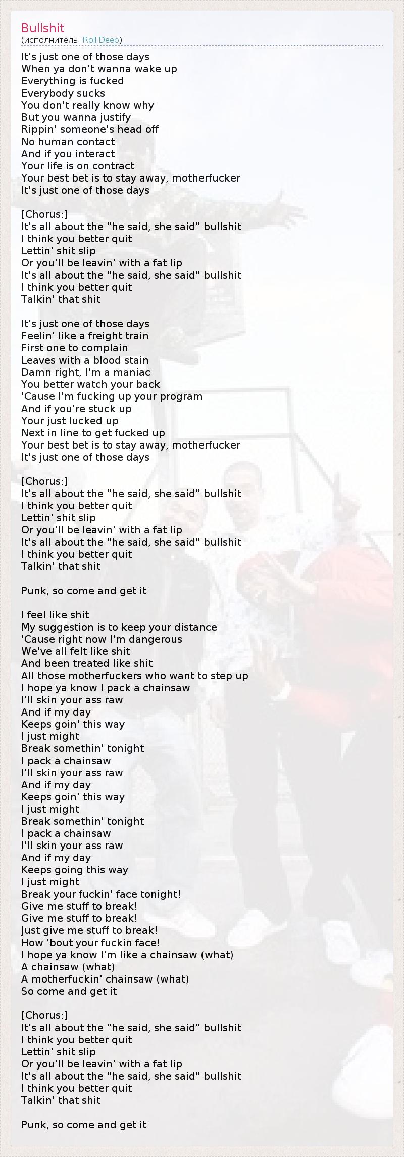 Ещё один из тех дней, Когда ты не хочешь просыпаться, Всё и все вокруг Достали. Ты не знаешь, почему это происходит, Но хочешь объяснить, Снести пару чьих-нибудь голов. Никаких контактов с людьми, А если будешь с ними общаться, Тебя просто закажут. Лучший вариант для тебя – стоять подальше, ублюд*к. Очередной такой день... [Припев:] Это всё хрень типа "Он сказал, она сказала...", По-моему, тебе лучше убраться, И забудем эту хрень, Иначе тебя оставят с порванным ртом. Это всё хрень типа "Он сказал, она сказала...", По-моему, тебе лучше убраться, Говоря эту чушь. Ещё один из тех дней, Когда ты нагружен, как товарный поезд. Первый, кто начнёт жаловаться, Вылетит с кровавой кашей на лице. Да, бл*ть, я маньяк! Лучше смотри, что у тебя за спиной, Потому что я испоганю тебе все планы, И если будешь кидать понты, Тебе пока везёт, Но ты – на очереди. Лучший вариант для тебя – стоять подальше, ублюд*к. Очередной такой день... [Припев:] Это всё хрень типа "Он сказал, она сказала...", По-моему, тебе лучше убраться, И забудем эту хрень, Иначе тебя оставят с порванным ртом. Это всё хрень типа "Он сказал, она сказала...", По-моему, тебе лучше убраться, Говоря эту чушь. Эй, гомик, иди сюда и получай! Я себя хреново чувствую, Мой тебе совет – не подходи, Потому что сейчас я могу быть опасным. Мы все хреново себя чувствовали, С нами обращались, как с дер*мом Все эти убл*дки, которые хотят быть выше. Надеюсь, ты знаешь: у меня есть бензопила, Я сдеру с тебя шкуру заживо, И если этот день Будет так идти и дальше, Я вполне могу Что-нибудь разнести этой ночью. Я взял с собой бензопилу, Я сдеру с тебя шкуру заживо, И если этот день Будет так идти и дальше, Я вполне могу Что-нибудь разнести этой ночью. Я взял с собой бензопилу, Я сдеру с тебя шкуру заживо, И если этот день Будет так идти и дальше, Я вполне могу Разнести твой е*альник в клочья! Дайте мне что-нибудь сломать! Дайте мне что-нибудь сломать! Просто дайте мне что-нибудь разнести! Как насчёт твоего е*аного лица? Надеюсь, ты знаешь, что у меня есть бензопила (что?) Бензопила! (что?) Грёбаная пила! (что?) Иди сюда и получи своё! [Припев:] Это всё хрень типа "Он сказал, она сказала...", По-моему, тебе лучше убраться, И забудем эту хрень, Иначе тебя оставят с порванным ртом. Это всё хрень типа "Он сказал, она сказала...", По-моему, тебе лучше убраться, Говоря эту чушь. Эй, гомик, иди сюда и получай!