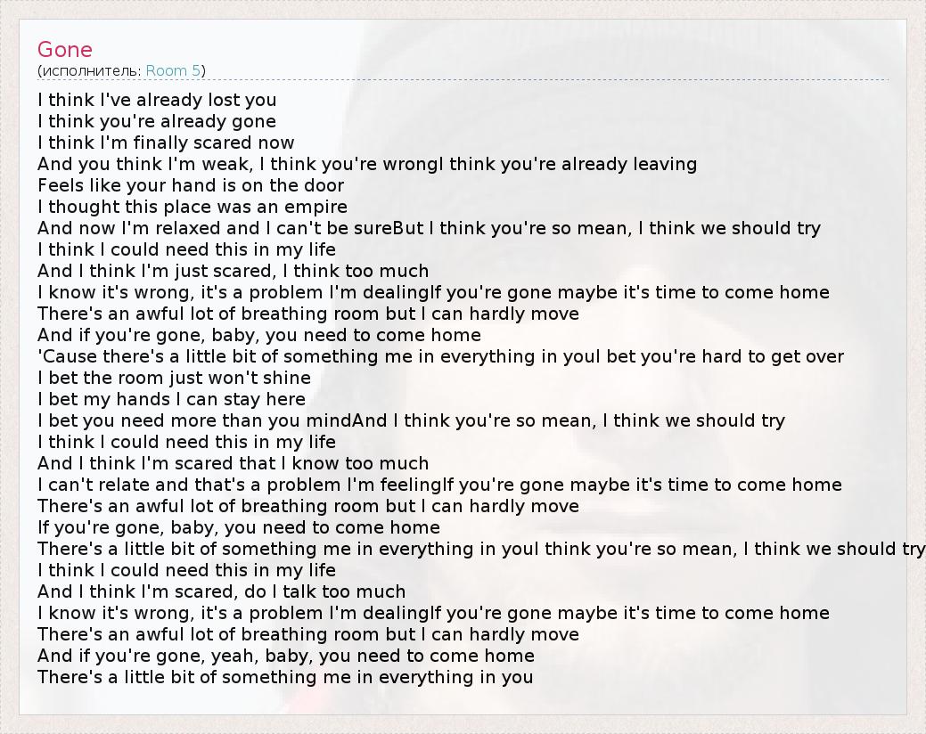 I think I've already lost you I think you're already gone I think I'm finally scared now And you think I'm weak, I think you're wrongI think you're already leaving Feels like your hand is on the door I thought this place was an empire And now I'm relaxed and I can't be sureBut I think you're so mean, I think we should try I think I could need this in my life And I think I'm just scared, I think too much I know it's wrong, it's a problem I'm dealingIf you're gone maybe it's time to come home There's an awful lot of breathing room but I can hardly move And if you're gone, baby, you need to come home 'Cause there's a little bit of something me in everything in youI bet you're hard to get over I bet the room just won't shine I bet my hands I can stay here I bet you need more than you mindAnd I think you're so mean, I think we should try I think I could need this in my life And I think I'm scared that I know too much I can't relate and that's a problem I'm feelingIf you're gone maybe it's time to come home There's an awful lot of breathing room but I can hardly move If you're gone, baby, you need to come home There's a little bit of something me in everything in youI think you're so mean, I think we should try I think I could need this in my life And I think I'm scared, do I talk too much I know it's wrong, it's a problem I'm dealingIf you're gone maybe it's time to come home There's an awful lot of breathing room but I can hardly move And if you're gone, yeah, baby, you need to come home There's a little bit of something me in everything in you