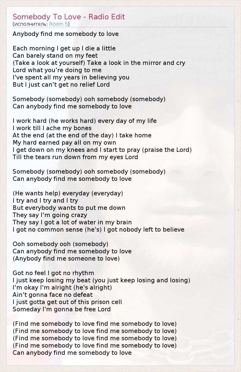 Anybody find me somebody to love Each morning I get up I die a little Can barely stand on my feet (Take a look at yourself) Take a look in the mirror and cry Lord what you're doing to me I've spent all my years in believing you But I just can't get no relief Lord Somebody (somebody) ooh somebody (somebody) Can anybody find me somebody to love I work hard (he works hard) every day of my life I work till I ache my bones At the end (at the end of the day) I take home My hard earned pay all on my own I get down on my knees and I start to pray (praise the Lord) Till the tears run down from my eyes Lord Somebody (somebody) ooh somebody (somebody) Can anybody find me somebody to love (He wants help) everyday (everyday) I try and I try and I try But everybody wants to put me down They say I'm going crazy They say I got a lot of water in my brain I got no common sense (he's) I got nobody left to believe Ooh somebody ooh (somebody) Can anybody find me somebody to love (Anybody find me someone to love) Got no feel I got no rhythm I just keep losing my beat (you just keep losing and losing) I'm okay I'm alright (he's alright) Ain't gonna face no defeat I just gotta get out of this prison cell Someday I'm gonna be free Lord (Find me somebody to love find me somebody to love) (Find me somebody to love find me somebody to love) (Find me somebody to love find me somebody to love) (Find me somebody to love find me somebody to love) Can anybody find me somebody to love