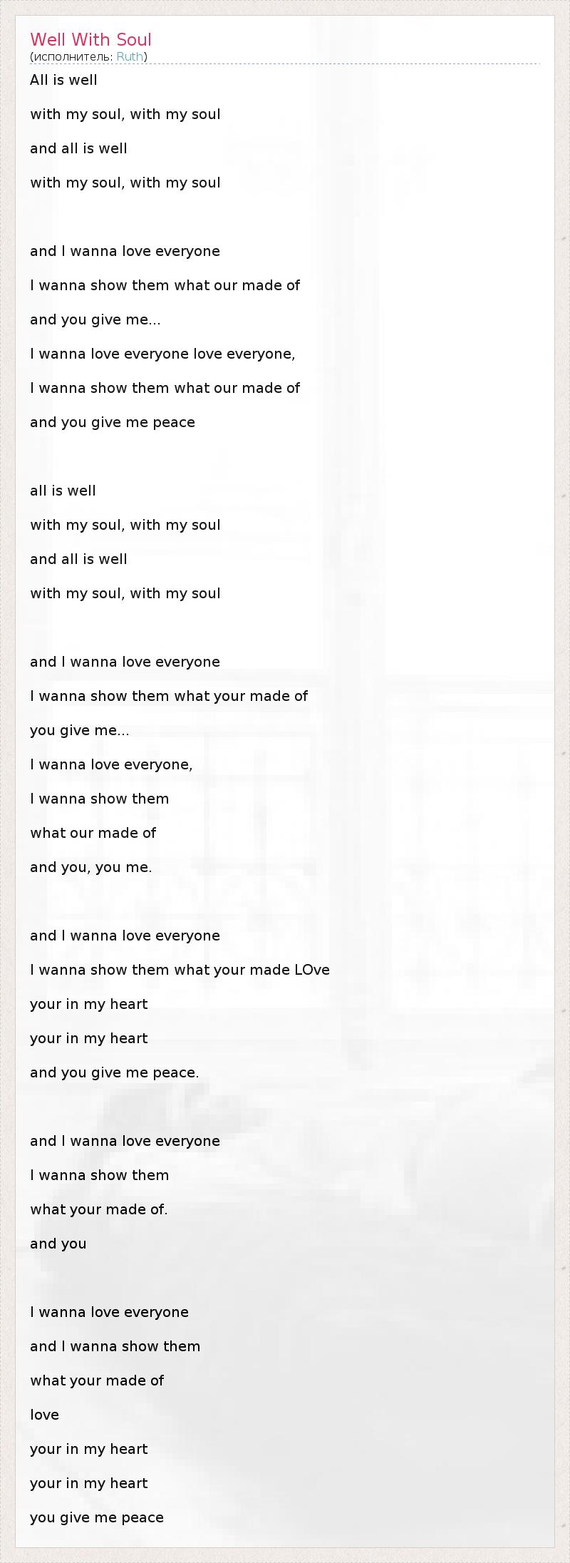 All is well with my soul, with my soul and all is well with my soul, with my soul and I wanna love everyone I wanna show them what our made of and you give me... I wanna love everyone love everyone, I wanna show them what our made of and you give me peace all is well with my soul, with my soul and all is well with my soul, with my soul and I wanna love everyone I wanna show them what your made of you give me... I wanna love everyone, I wanna show them what our made of and you, you me. and I wanna love everyone I wanna show them what your made LOve your in my heart your in my heart and you give me peace. and I wanna love everyone I wanna show them what your made of. and you I wanna love everyone and I wanna show them what your made of love your in my heart your in my heart you give me peace