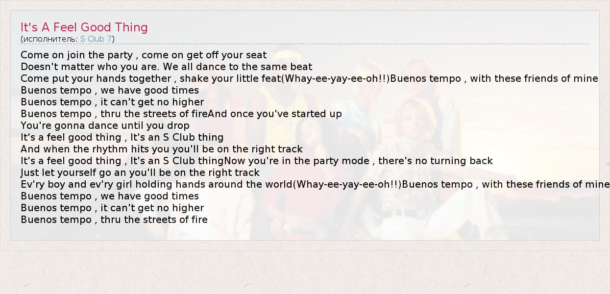 Come on join the party , come on get off your seat Doesn't matter who you are. We all dance to the same beat Come put your hands together , shake your little feat(Whay-ee-yay-ee-oh!!)Buenos tempo , with these friends of mine Buenos tempo , we have good times Buenos tempo , it can't get no higher Buenos tempo , thru the streets of fireAnd once you've started up You're gonna dance until you drop It's a feel good thing , It's an S Club thing And when the rhythm hits you you'll be on the right track It's a feel good thing , It's an S Club thingNow you're in the party mode , there's no turning back Just let yourself go an you'll be on the right track Ev'ry boy and ev'ry girl holding hands around the world(Whay-ee-yay-ee-oh!!)Buenos tempo , with these friends of mine Buenos tempo , we have good times Buenos tempo , it can't get no higher Buenos tempo , thru the streets of fire