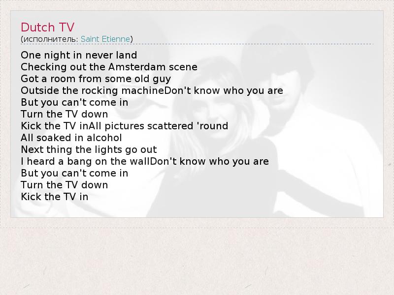 One night in never land Checking out the Amsterdam scene Got a room from some old guy Outside the rocking machineDon't know who you are But you can't come in Turn the TV down Kick the TV inAll pictures scattered 'round All soaked in alcohol Next thing the lights go out I heard a bang on the wallDon't know who you are But you can't come in Turn the TV down Kick the TV in