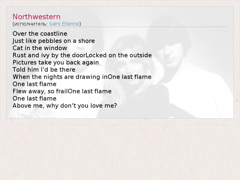 Over the coastline Just like pebbles on a shore Cat in the window Rust and ivy by the doorLocked on the outside Pictures take you back again Told him I'd be there When the nights are drawing inOne last flame One last flame Flew away, so frailOne last flame One last flame Above me, why don't you love me?
