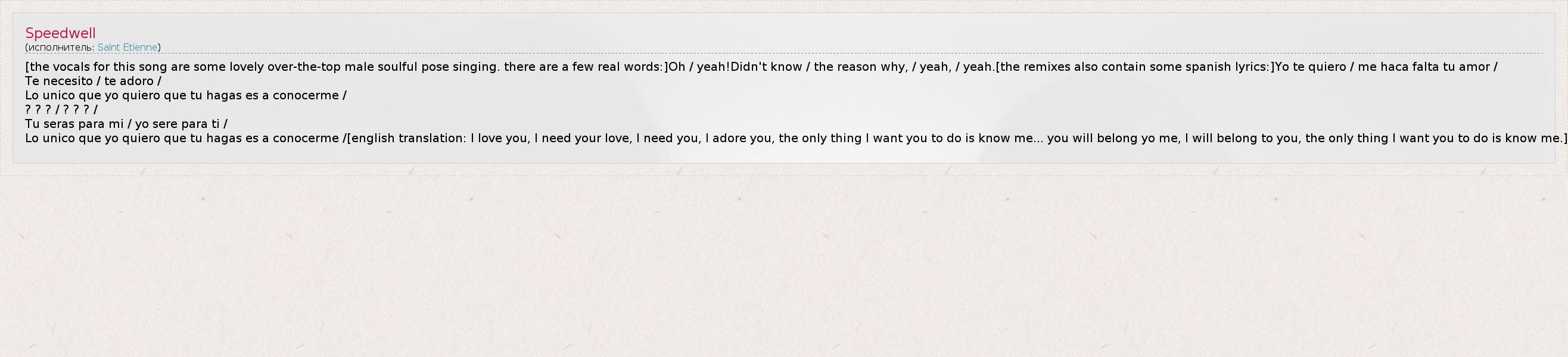 [the vocals for this song are some lovely over-the-top male soulful pose singing. there are a few real words:]Oh / yeah!Didn't know / the reason why, / yeah, / yeah.[the remixes also contain some spanish lyrics:]Yo te quiero / me haca falta tu amor /