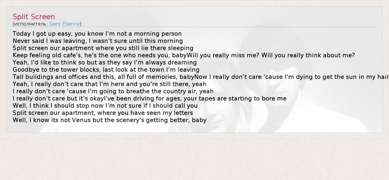 Это интересно:Трудно представить историю британской поп-музыки без «Saint Etienne». Их удивительная способность выпускать пластинки с настроением «шестидесятых» стала главной отличительной чертой группы. Вот уже десять лет «Saint Etienne» по праву занимают место самой стильной группы в Англии. «Музыка дизайнеров и арт-директоров» - такое определение «Saint Etienne» получили из уст одного журналиста. И действительно,... продолжение