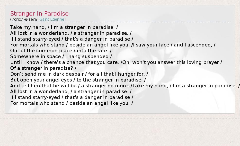 А как ты думаешь, о чем песня "Stranger In Paradise" ?