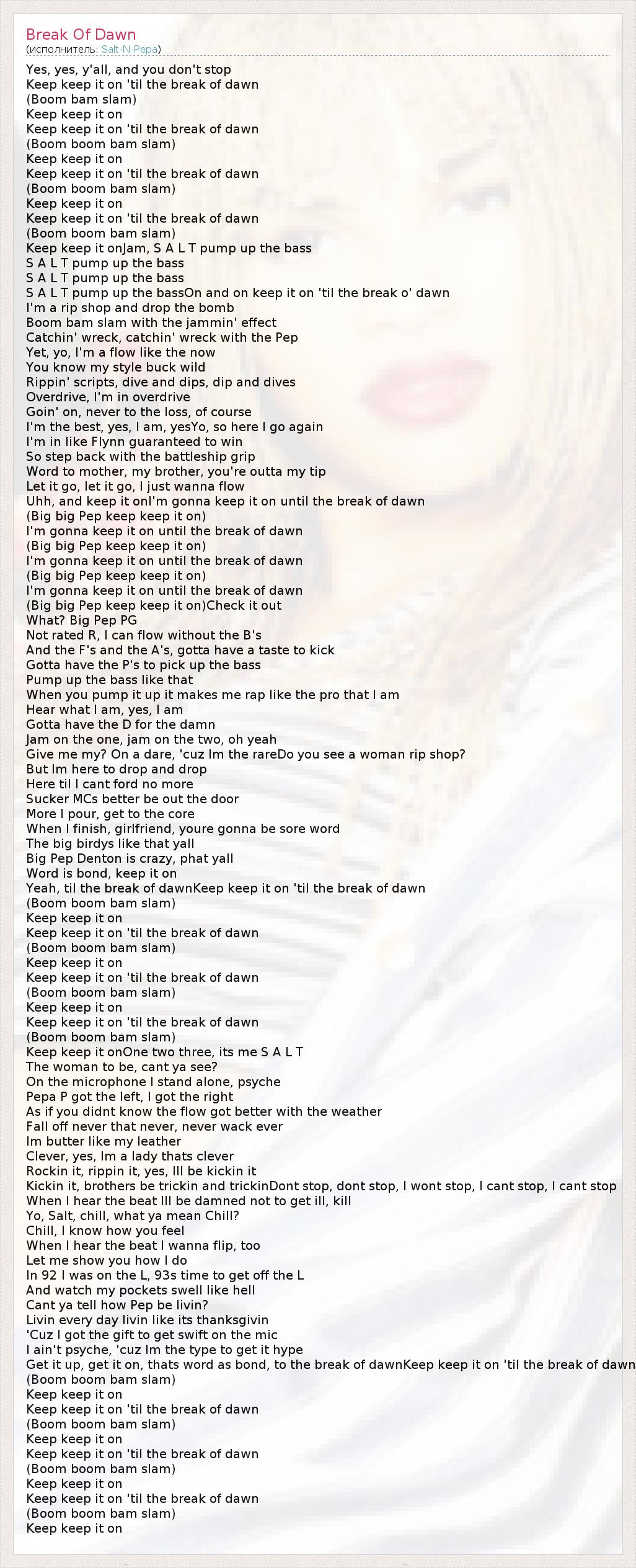 S A L T pump up the bassOn and on keep it on 'til the break o' dawn