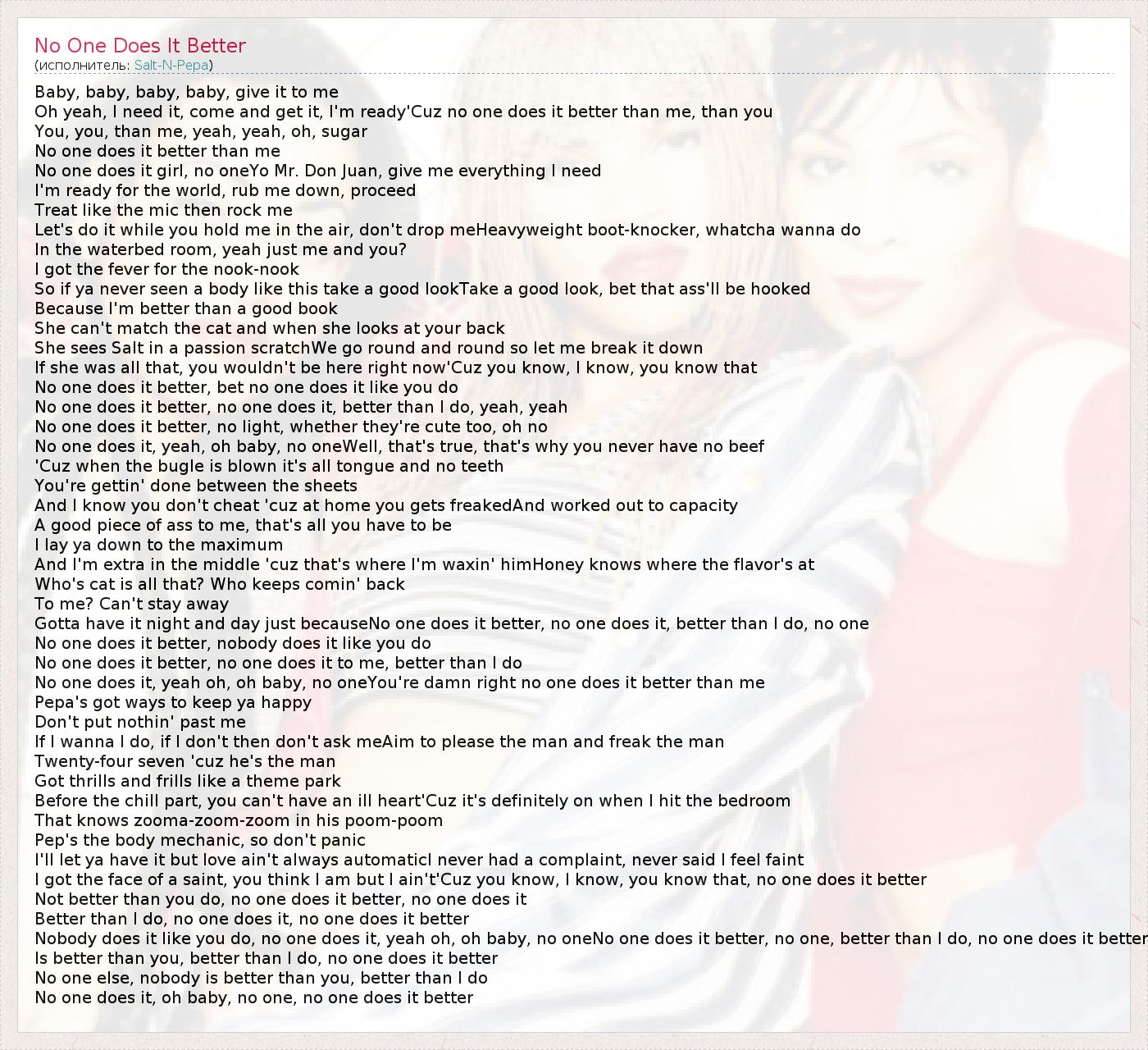 Nobody does it like you do, no one does it, yeah oh, oh baby, no oneNo one does it better, no one, better than I do, no one does it better