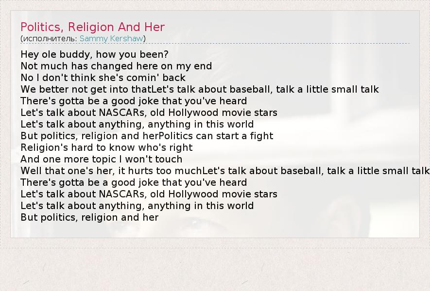 А как ты думаешь, о чем песня "Politics, Religion And Her" ?