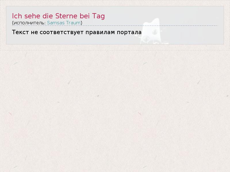 Ви konntest Du Dich нур дер Liebe , Allem widersetzen ? Саг » , Wohin Bist Du gegangen , был шляпу Dich нур übermannt ? Ви нур konntest Du ден Tod в Deinem Герцена Leben Лассен ? Er Trieb Dich Weit фон мир Weg , эс Зогу Dich Immer в ден рэнд Ich laufe Zwischen Baumen унд verfange Mich в Netzen Wenn ич Träume , Träume Ich фон Эрде , умирают Wie ReGen fällt В дер Бруст klopft Eine Schaufel , steigt дас gleißend Хелле Wasser Ви маг эс Dir Дорт ergehen , в дер Schlinge deiner Welt ? Ich gehöre Nicht Euch , ММСП silbrigen Волькен Ich бен Ош Nicht Дейн , о eisblaues Licht Ich gehöre дем Jenseits , дер Anderen Seite Дем pechschwarzen Abgrund , дем Jüngsten Gericht Mit welchen Worten Soll ич wiedergeben , был Nicht denkbar ист ? Ich könnte Dich Nicht Halten , Ви Soll ич да фон Dir Sprechen ? Ich brauche Neue Laute . Был für Laute ? Nein, ич кенн Sie Nicht Ich fühle , вэй Sie Ауф дер Zunge ,ден Zähnen brechen Es войны Dir Стець gegeben , Ауф ден Meeresgrund цу Schauen Heute sehe ич Wie Du умереть Sterne Leuchten , Ош бай тегов Ich liebte Dich так Sehr , ич Hatte так Nicht Lieben dürfen Вайль умереть Liebe vieles Нур Nicht Dich zurück цу bringen vermag Und бен ич gestorben , Данн Tragen Mich Лидер Вор Euchден offenen Fenstern Vorbei Mein Kopf schaukelt sanft , Gleich ден Halmen я Боден Де Brunnens , ич Breche утра Heimweh entzwei