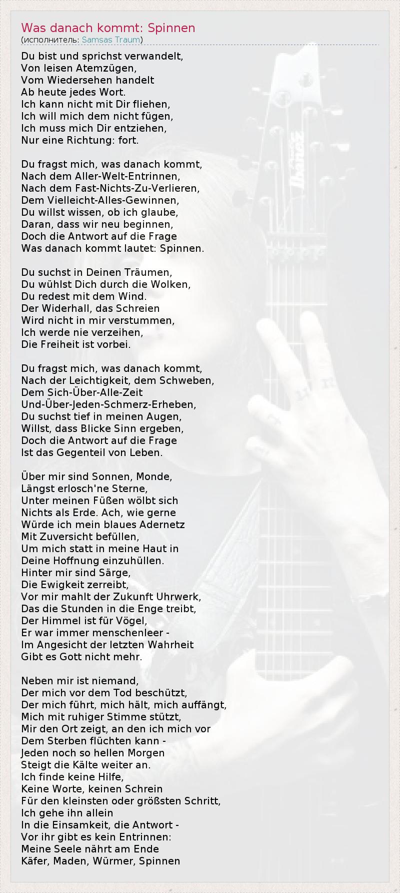 ГлавнаяИсполнителиSamsas TraumWas danach kommt: Spinnen