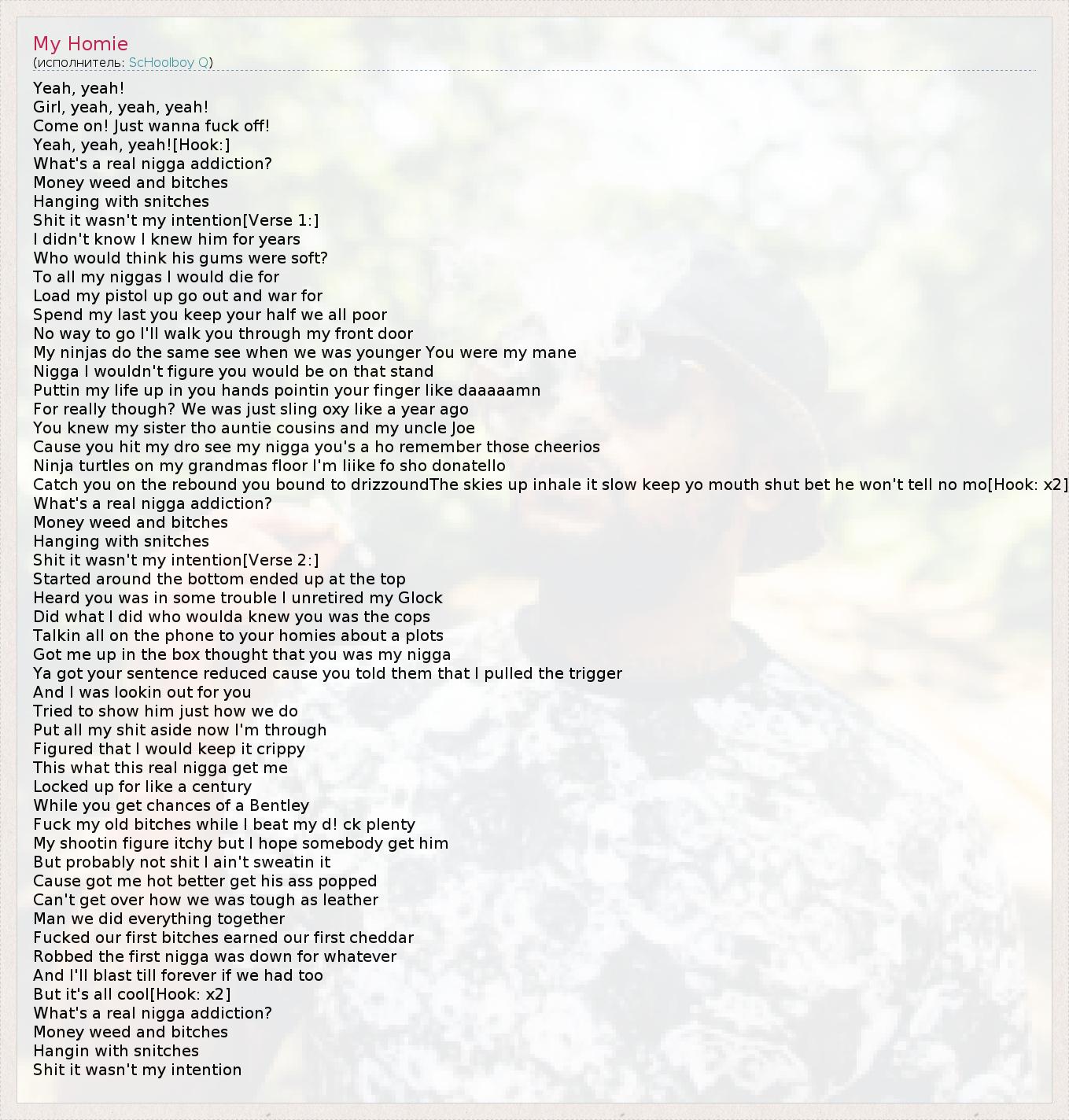 Это интересно:Квинси Мэтью Хэнли (родился 26 октября 1986 года) — более известен под своим сценическим псевдонимом ScHoolBoy Q, американский рэппер подписанный на лейблах Top Dawg Entertainment и Interscope Records. Квинси является участником хип-хоп супергруппы Black Hippy наряду с другими артистами Top Dawg Entertainment как: Ab-Soul, Jay Rock и Kendrick Lamar.Его первый независимый... продолжение