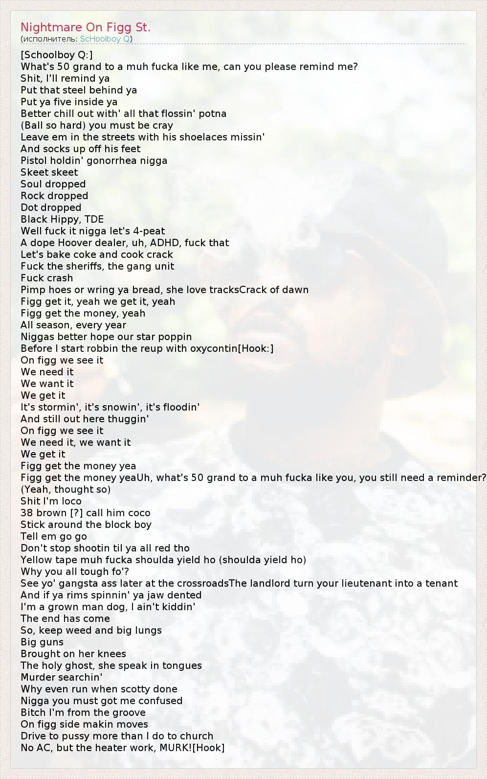 [Schoolboy Q:] What's 50 grand to a muh fucka like me, can you please remind me? Shit, I'll remind ya Put that steel behind ya Put ya five inside ya Better chill out with' all that flossin' potna (Ball so hard) you must be cray Leave em in the streets with his shoelaces missin' And socks up off his feet Pistol holdin' gonorrhea nigga Skeet skeet Soul dropped Rock dropped Dot dropped Black Hippy, TDE Well fuck it nigga let's 4-peat A dope Hoover dealer, uh, ADHD, fuck that Let's bake coke and cook crack Fuck the sheriffs, the gang unit Fuck crash Pimp hoes or wring ya bread, she love tracksCrack of dawn Figg get it, yeah we get it, yeah Figg get the money, yeah All season, every year Niggas better hope our star poppin Before I start robbin the reup with oxycontin[Hook:] On figg we see it We need it We want it We get it It's stormin', it's snowin', it's floodin' And still out here thuggin' On figg we see it We need it, we want it We get it Figg get the money yea Figg get the money yeaUh, what's 50 grand to a muh fucka like you, you still need a reminder? (Yeah, thought so) Shit I'm loco 38 brown [?] call him coco Stick around the block boy Tell em go go Don't stop shootin til ya all red tho Yellow tape muh fucka shoulda yield ho (shoulda yield ho) Why you all tough fo'? See yo' gangsta ass later at the crossroadsThe landlord turn your lieutenant into a tenant And if ya rims spinnin' ya jaw dented I'm a grown man dog, I ain't kiddin' The end has come So, keep weed and big lungs Big guns Brought on her knees The holy ghost, she speak in tongues Murder searchin' Why even run when scotty done Nigga you must got me confused Bitch I'm from the groove On figg side makin moves Drive to pussy more than I do to church No AC, but the heater work, MURK![Hook]