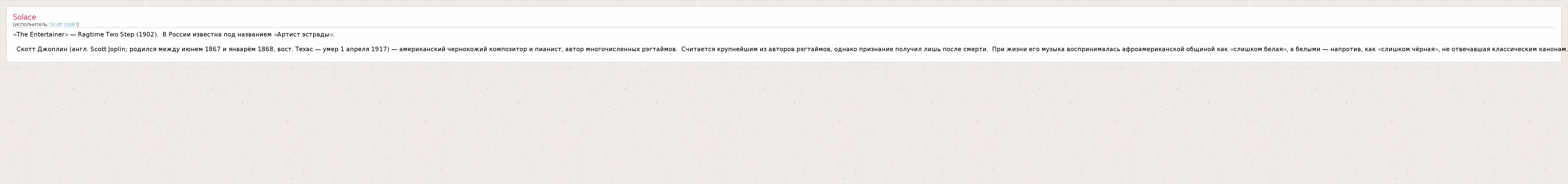 Это интересно:Скотт Джо́плин (англ. Scott Joplin; 24 ноября 1868 года, Северный Техас — 1 апреля 1917 года, Нью-Йорк) — афроамериканский композитор и пианист, автор 44 регтаймов, наиболее известный из которых — «Артист эстрады (англ.)русск.» (англ. «The Entertainer»). Считается крупнейшим автором рэгтаймов, однако признание получил лишь после смерти. При жизни его музыка воспринималась афроамериканской общиной как «слишком... продолжение