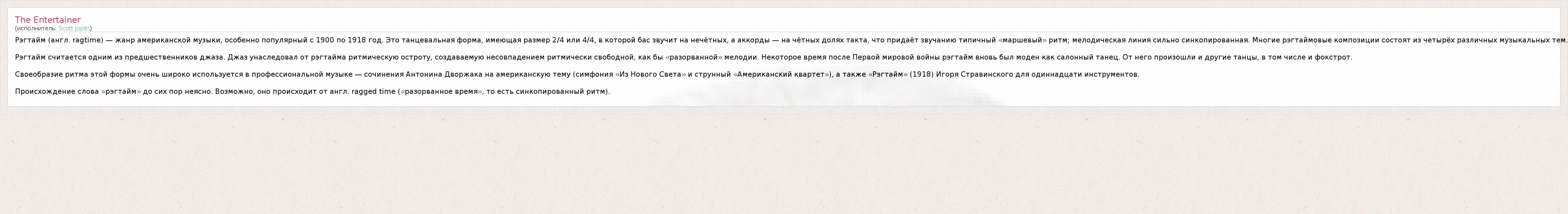 Это интересно:Скотт Джо́плин (англ. Scott Joplin; 24 ноября 1868 года, Северный Техас — 1 апреля 1917 года, Нью-Йорк) — афроамериканский композитор и пианист, автор 44 регтаймов, наиболее известный из которых — «Артист эстрады (англ.)русск.» (англ. «The Entertainer»). Считается крупнейшим автором рэгтаймов, однако признание получил лишь после смерти. При жизни его музыка воспринималась афроамериканской общиной как «слишком... продолжение