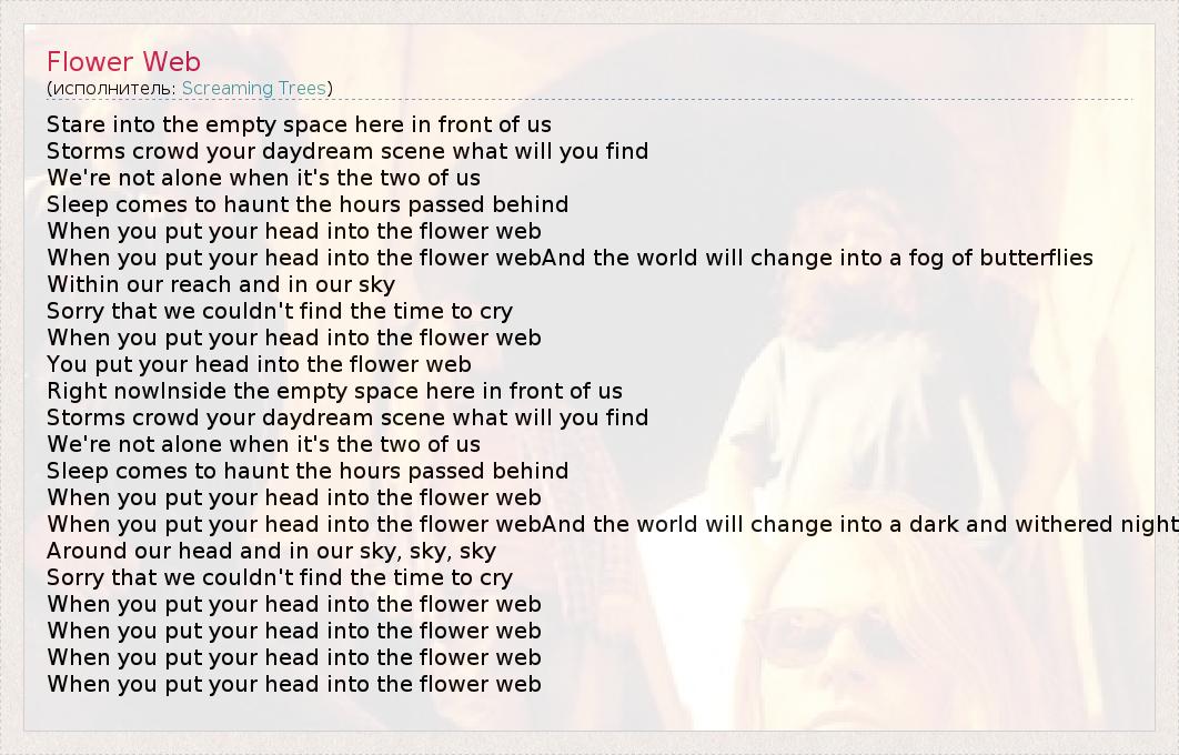 Stare into the empty space here in front of us Storms crowd your daydream scene what will you find We're not alone when it's the two of us Sleep comes to haunt the hours passed behind When you put your head into the flower web When you put your head into the flower webAnd the world will change into a fog of butterflies Within our reach and in our sky Sorry that we couldn't find the time to cry When you put your head into the flower web You put your head into the flower web Right nowInside the empty space here in front of us Storms crowd your daydream scene what will you find We're not alone when it's the two of us Sleep comes to haunt the hours passed behind When you put your head into the flower web When you put your head into the flower webAnd the world will change into a dark and withered night Around our head and in our sky, sky, sky Sorry that we couldn't find the time to cry When you put your head into the flower web When you put your head into the flower web When you put your head into the flower web When you put your head into the flower web