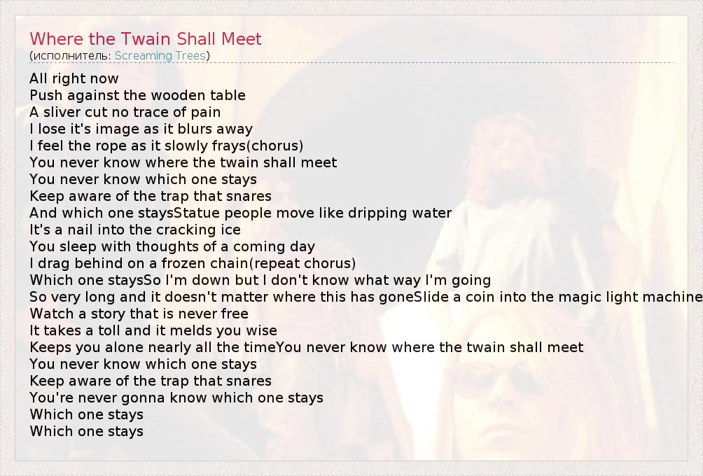 А как ты думаешь, о чем песня "Where the Twain Shall Meet" ?