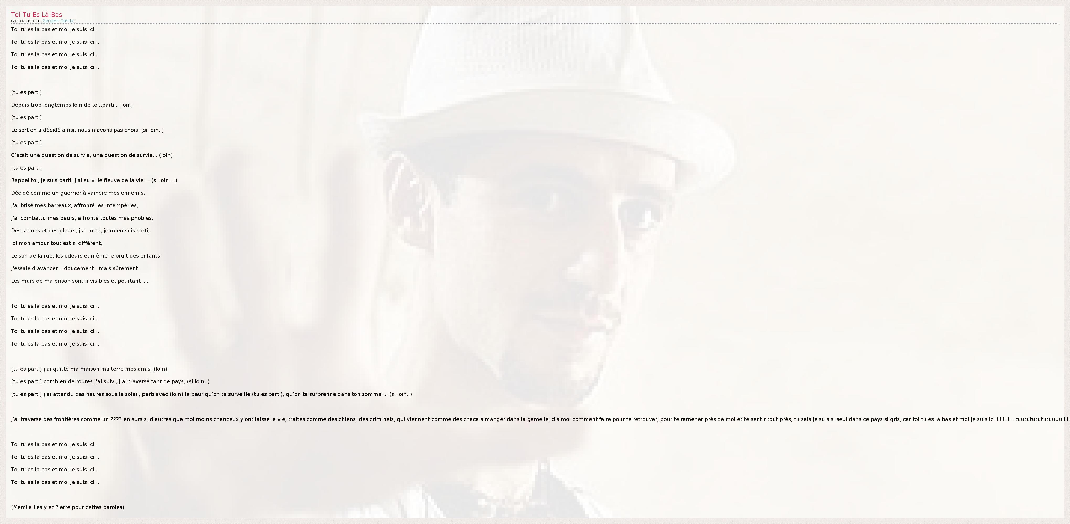 J'ai traversé des frontières comme un ???? en sursis, d'autres que moi moins chanceux y ont laissé la vie, traités comme des chiens, des criminels, qui viennent comme des chacals manger dans la gamelle, dis moi comment faire pour te retrouver, pour te ramener près de moi et te sentir tout près, tu sais je suis si seul dans ce pays si gris, car toi tu es la bas et moi je suis iciiiiiiiiii... tuutututututuuuuiiiii