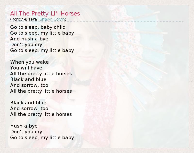 Go to sleep, baby child Go to sleep, my little baby And hush-a-bye Don't you cry Go to sleep, my little baby When you wake You will have All the pretty little horses Black and blue And sorrow, too All the pretty little horses Black and blue And sorrow, too All the pretty little horses Hush-a-bye Don't you cry Go to sleep, my little baby