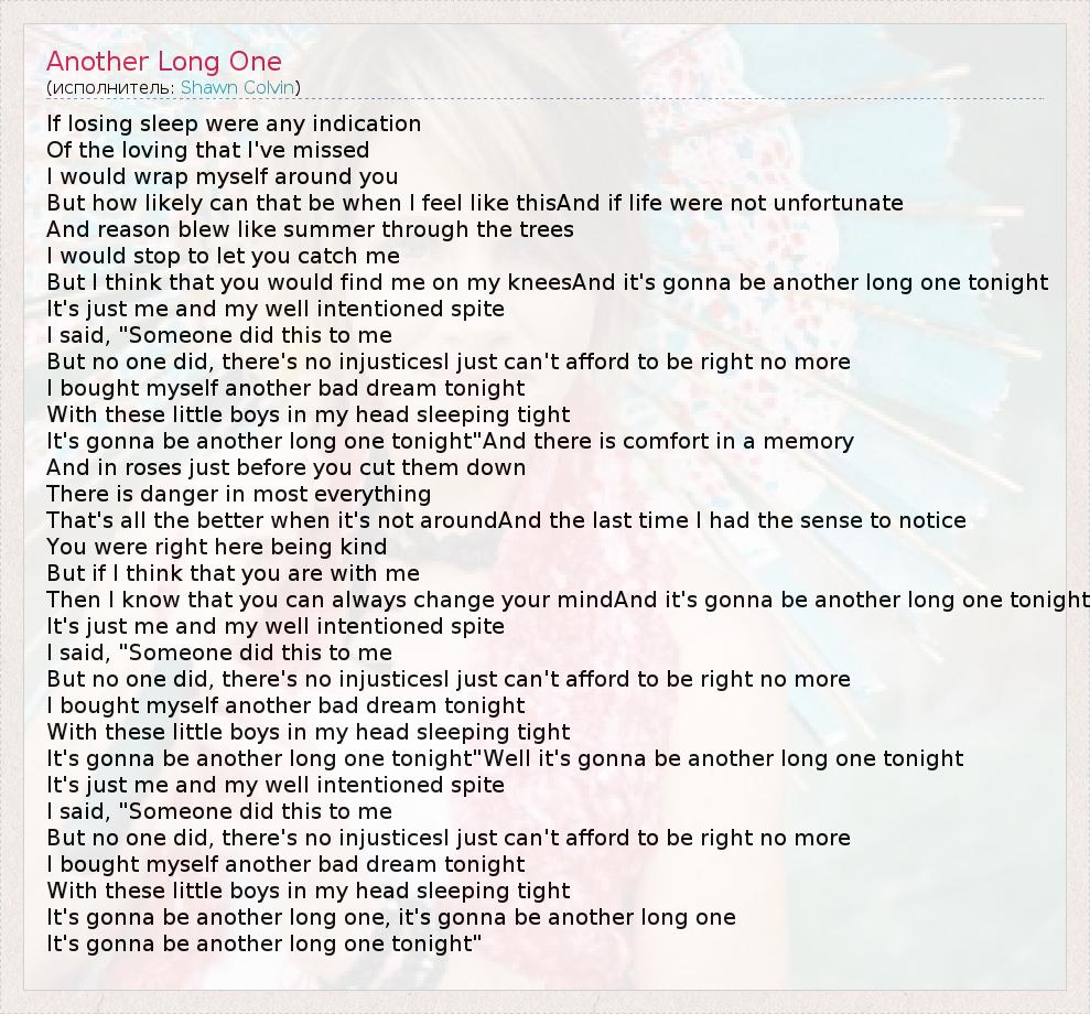 It's gonna be another long one tonight"Well it's gonna be another long one tonight