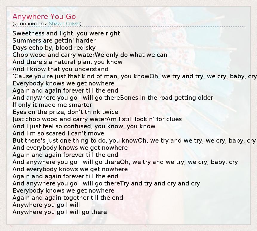Sweetness and light, you were right Summers are gettin' harder Days echo by, blood red sky Chop wood and carry waterWe only do what we can And there's a natural plan, you know And I know that you understand 'Cause you're just that kind of man, you knowOh, we try and try, we cry, baby, cry Everybody knows we get nowhere Again and again forever till the end And anywhere you go I will go thereBones in the road getting older If only it made me smarter Eyes on the prize, don't think twice Just chop wood and carry waterAm I still lookin' for clues And I just feel so confused, you know, you know And I'm so scared I can't move But there's just one thing to do, you knowOh, we try and we try, we cry, baby, cry And everybody knows we get nowhere Again and again forever till the end And anywhere you go I will go thereOh, we try and we try, we cry, baby, cry And everybody knows we get nowhere Again and again forever till the end And anywhere you go I will go thereTry and try and cry and cry Everybody knows we get nowhere Again and again together till the end Anywhere you go I will Anywhere you go I will go there