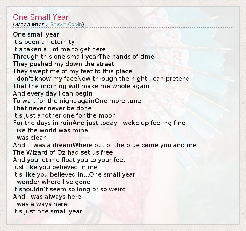 One small year It's been an eternity It's taken all of me to get here Through this one small yearThe hands of time They pushed my down the street They swept me of my feet to this place I don't know my faceNow through the night I can pretend That the morning will make me whole again And every day I can begin To wait for the night againOne more tune That never never be done It's just another one for the moon For the days in ruinAnd just today I woke up feeling fine Like the world was mine I was clean And it was a dreamWhere out of the blue came you and me The Wizard of Oz had set us free And you let me float you to your feet Just like you believed in me It's like you believed in...One small year I wonder where I've gone It shouldn't seem so long or so weird And I was always here I was always here It's just one small year