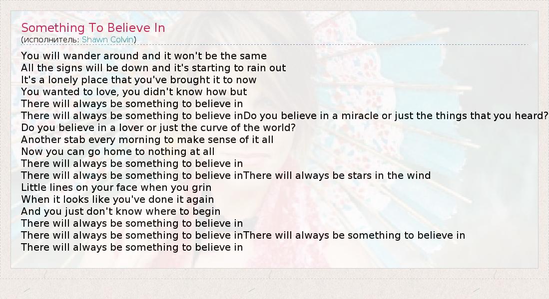 ГлавнаяИсполнителиShawn ColvinSomething To Believe In