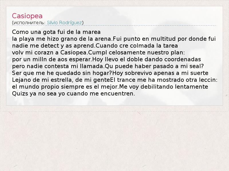 Como una gota fui de la marea la playa me hizo grano de la arena.Fui punto en multitud por donde fui nadie me detect y as aprend.Cuando cre colmada la tarea volv mi corazn a Casiopea.Cumpl celosamente nuestro plan: por un milln de aos esperar.Hoy llevo el doble dando coordenadas pero nadie contesta mi llamada.Qu puede haber pasado a mi seal? Ser que me he quedado sin hogar?Hoy sobrevivo apenas a mi suerte Lejano de mi estrella, de mi genteEl trance me ha mostrado otra leccin: el mundo propio siempre es el mejor.Me voy debilitando lentamente Quizs ya no sea yo cuando me encuentren.