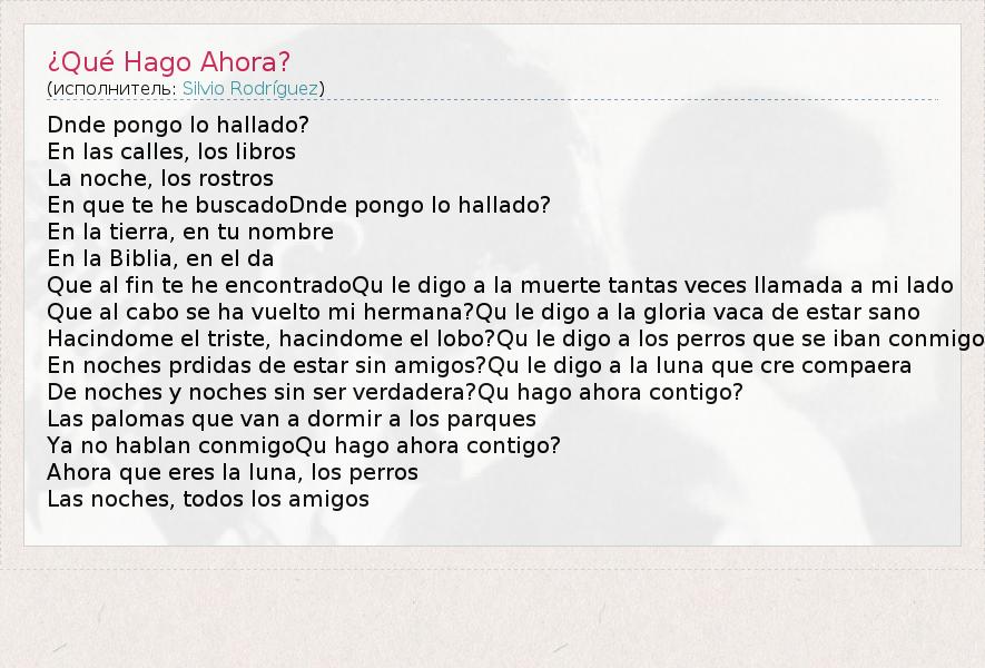Это интересно:Си́львио Родри́гес Доми́нгес (исп. Silvio Rodríguez Domínguez; Сан-Антонио-де-Лос-Баньос, Куба, 29 ноября 1946) — кубинский музыкант, поэт и певец, oдин из основателей (наряду с Ноэлем Николой и Пабло Миланесом) кубинского песенного движения Новая Трова.За более чем 40 лет поэтического и музыкального творчества Сильвио Родригес написал огромное количество песен (от 600 до 1000, точная цифра неизвестна),... продолжение