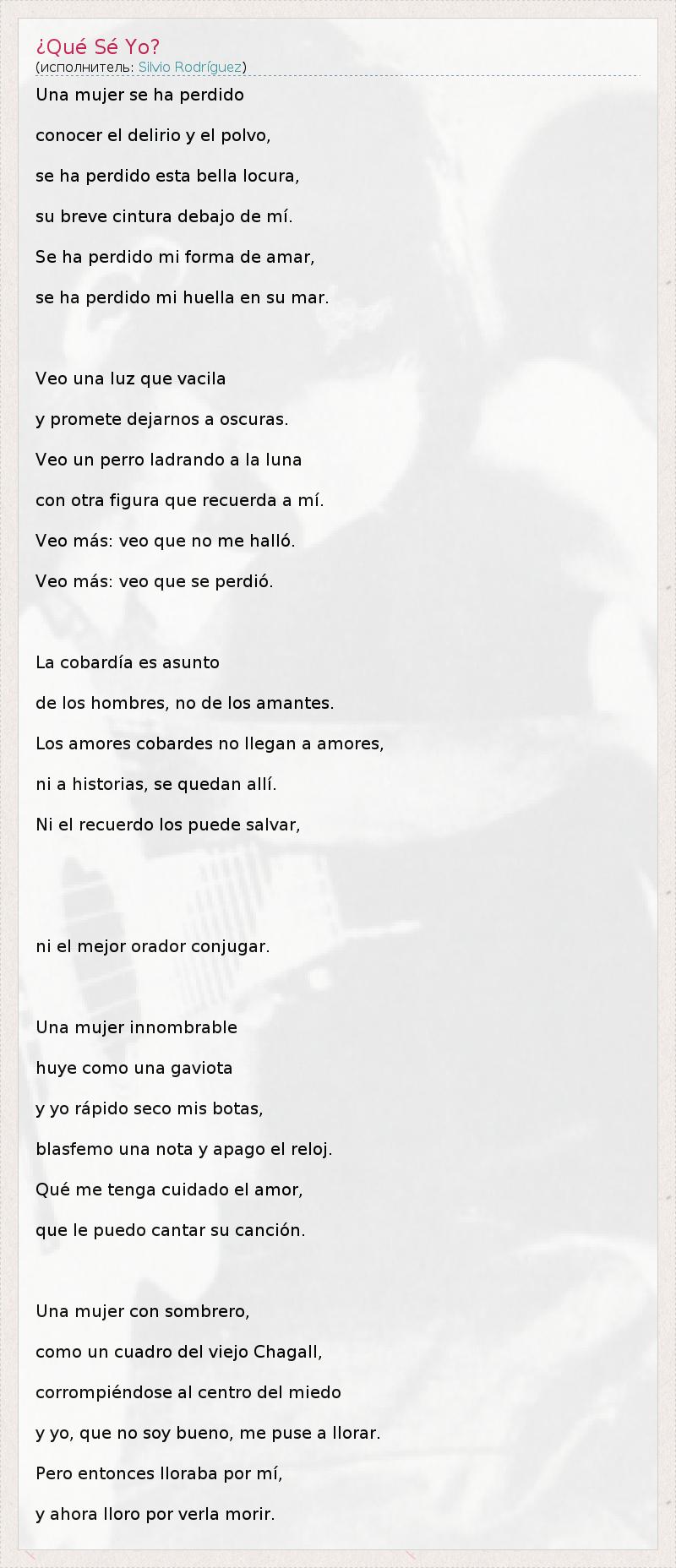 Это интересно:Си́львио Родри́гес Доми́нгес (исп. Silvio Rodríguez Domínguez; Сан-Антонио-де-Лос-Баньос, Куба, 29 ноября 1946) — кубинский музыкант, поэт и певец, oдин из основателей (наряду с Ноэлем Николой и Пабло Миланесом) кубинского песенного движения Новая Трова.За более чем 40 лет поэтического и музыкального творчества Сильвио Родригес написал огромное количество песен (от 600 до 1000, точная цифра неизвестна),... продолжение