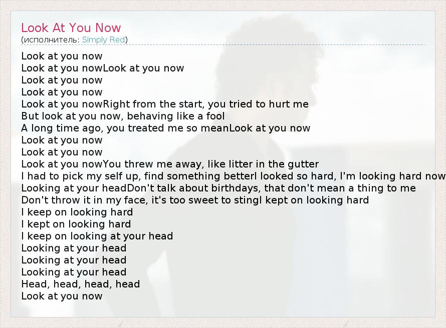 Look at you now Look at you nowLook at you now Look at you now Look at you now Look at you nowRight from the start, you tried to hurt me But look at you now, behaving like a fool A long time ago, you treated me so meanLook at you now Look at you now Look at you now Look at you nowYou threw me away, like litter in the gutter I had to pick my self up, find something betterI looked so hard, I'm looking hard now Looking at your headDon't talk about birthdays, that don't mean a thing to me Don't throw it in my face, it's too sweet to stingI kept on looking hard I keep on looking hard I kept on looking hard I keep on looking at your head Looking at your head Looking at your head Looking at your head Head, head, head, head Look at you now