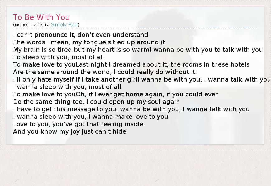 I'll only hate myself if I take another girlI wanna be with you, I wanna talk with you