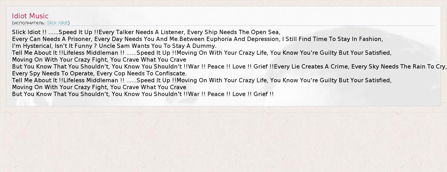Slick Idiot !! ......Speed It Up !!Every Talker Needs A Listener, Every Ship Needs The Open Sea, Every Can Needs A Prisoner, Every Day Needs You And Me.Between Euphoria And Depression, I Still Find Time To Stay In Fashion, I'm Hysterical, Isn't It Funny ? Uncle Sam Wants You To Stay A Dummy. Tell Me About It !!Lifeless Middleman !! ......Speed It Up !!Moving On With Your Crazy Life, You Know You're Guilty But Your Satisfied, Moving On With Your Crazy Fight, You Crave What You Crave But You Know That You Shouldn't, You Know You Shouldn't !!War !! Peace !! Love !! Grief !!Every Lie Creates A Crime, Every Sky Needs The Rain To Cry, Every Spy Needs To Operate, Every Cop Needs To Confiscate. Tell Me About It !!Lifeless Middleman !! ......Speed It Up !!Moving On With Your Crazy Life, You Know You're Guilty But Your Satisfied, Moving On With Your Crazy Fight, You Crave What You Crave But You Know That You Shouldn't, You Know You Shouldn't !!War !! Peace !! Love !! Grief !!